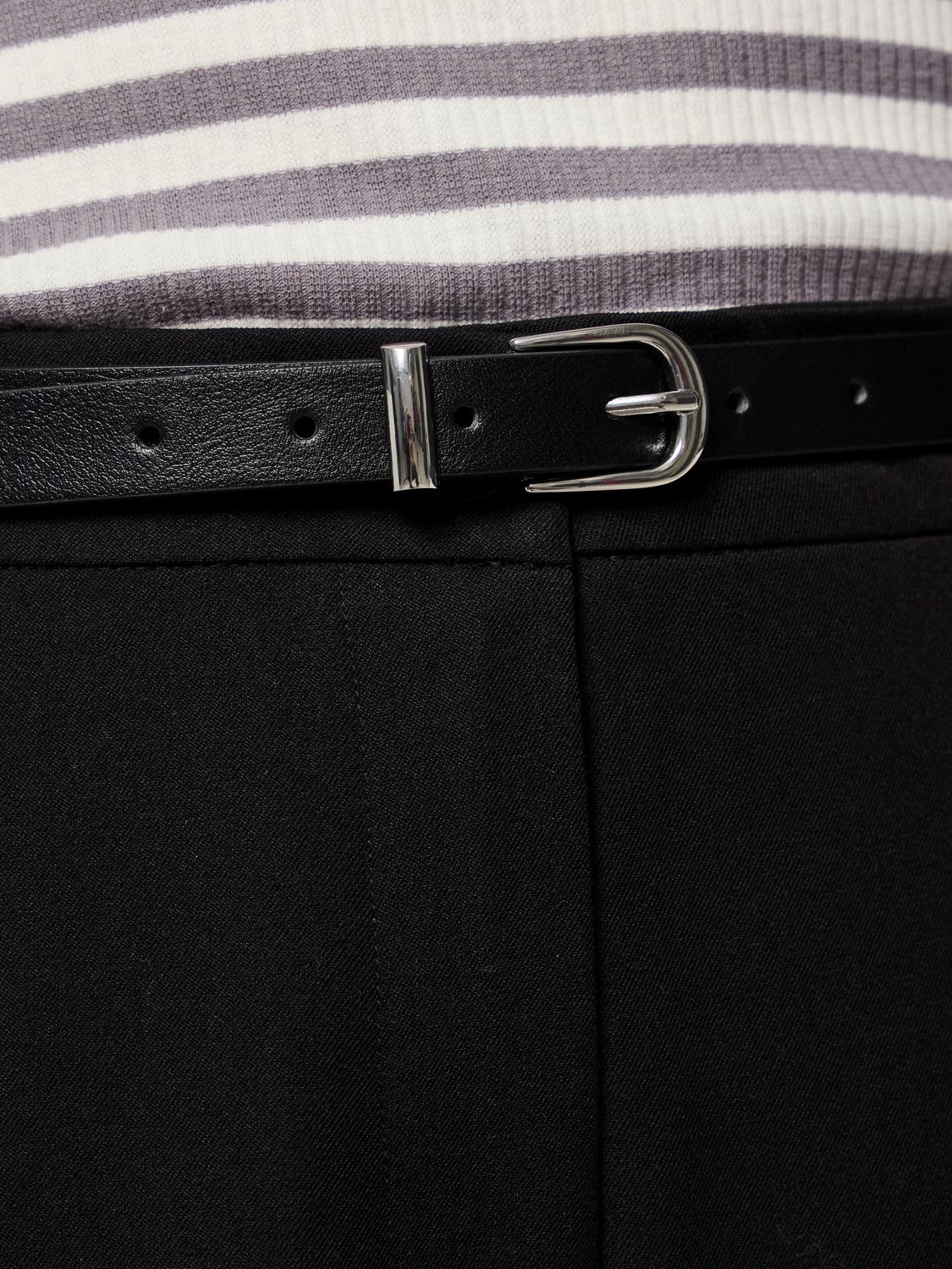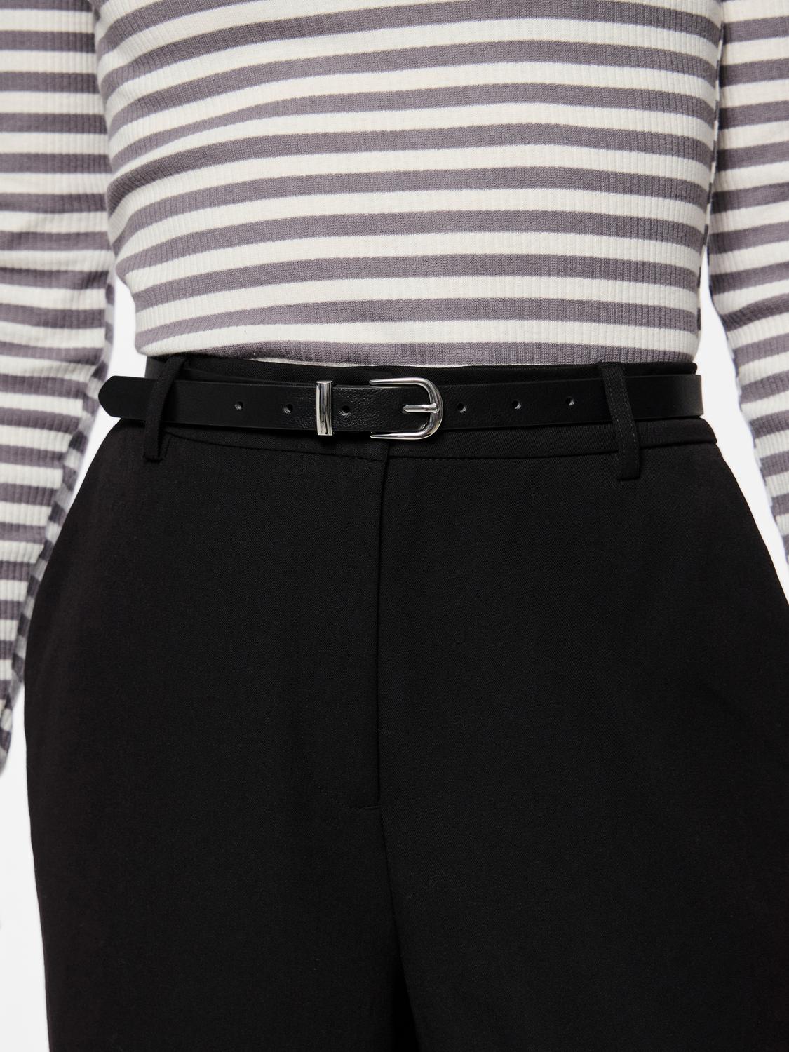 This elegant slim belt is designed to tie your look together with both practical function and stylish expression. The belt is made of polyester, which is coated with a layer of polyurethane, giving it a lightweight and water-repellent quality, perfect for everyday use. The silver-colored buckle adds a discreet detail that emphasizes the belt's modern character.