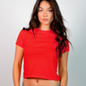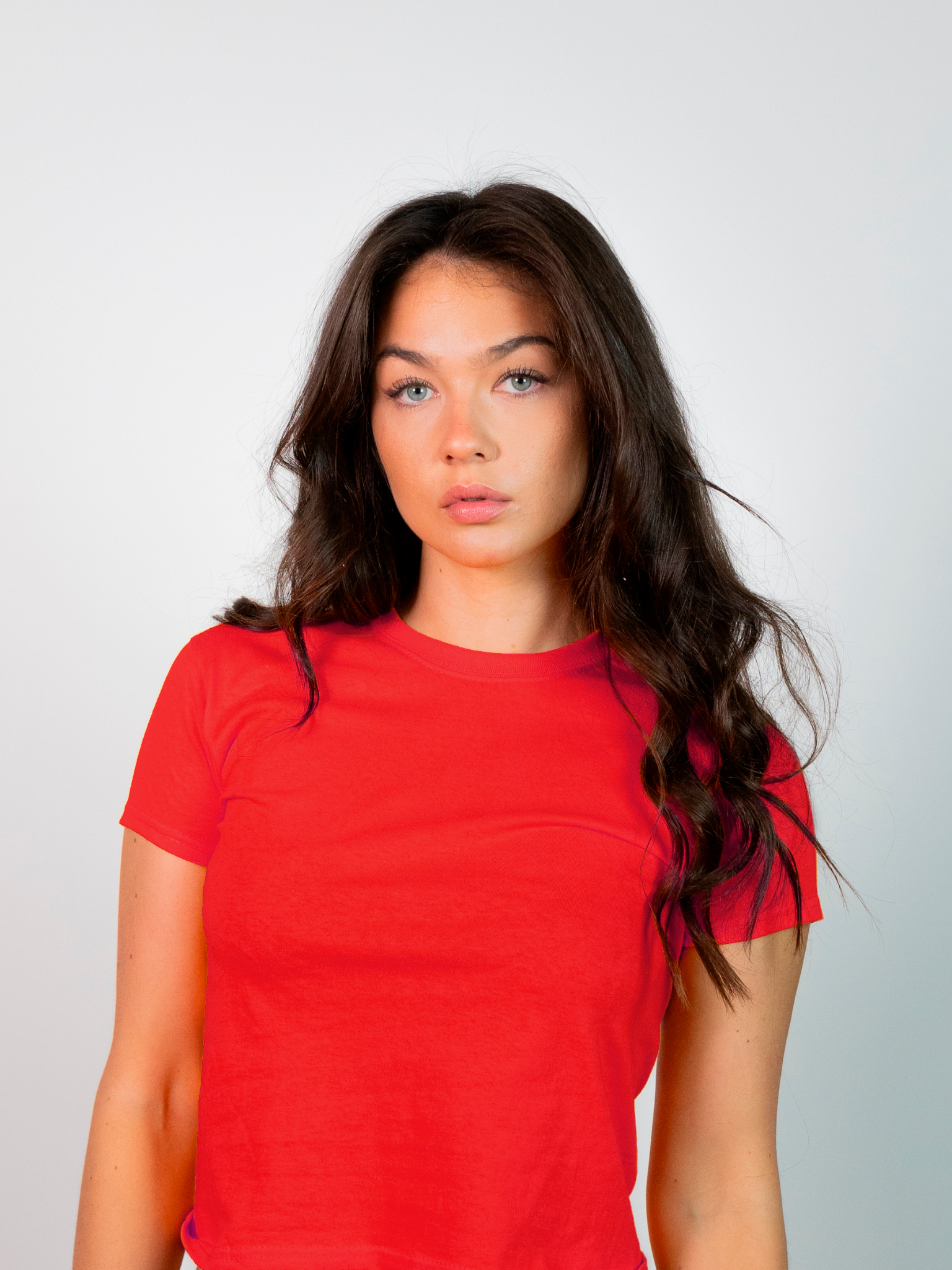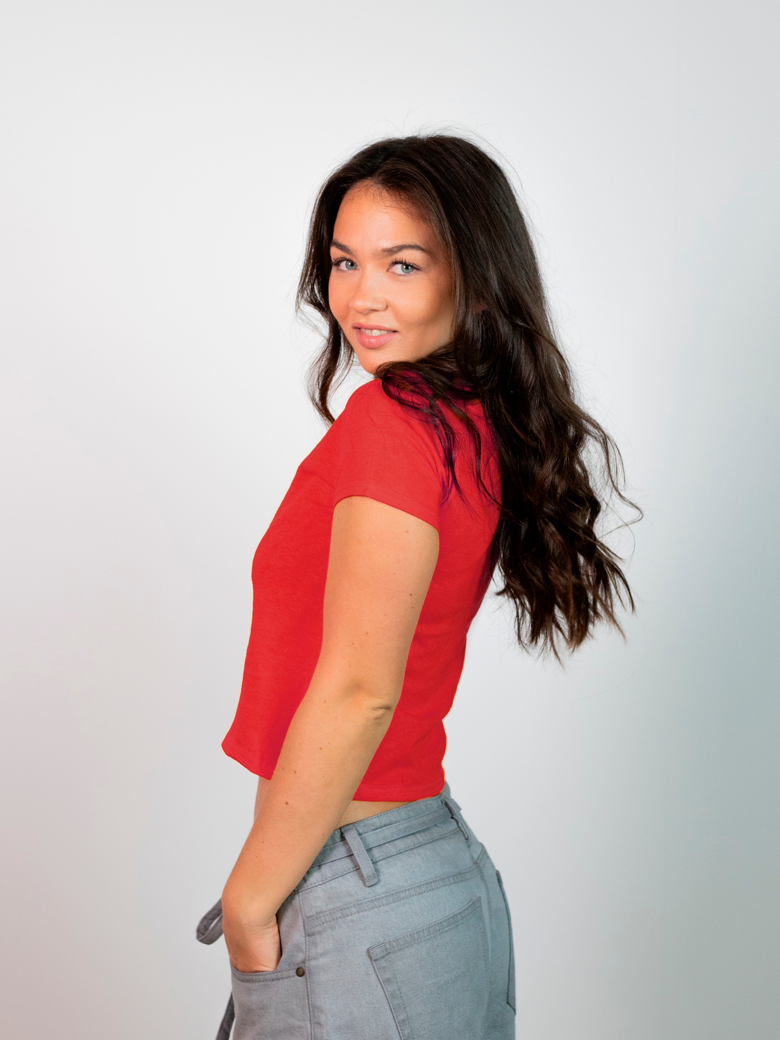 The model is American children's size, so it fits just right (cropped/tight). We have evaluated the sizes for you, so you get the right look if you choose your normal adult size.