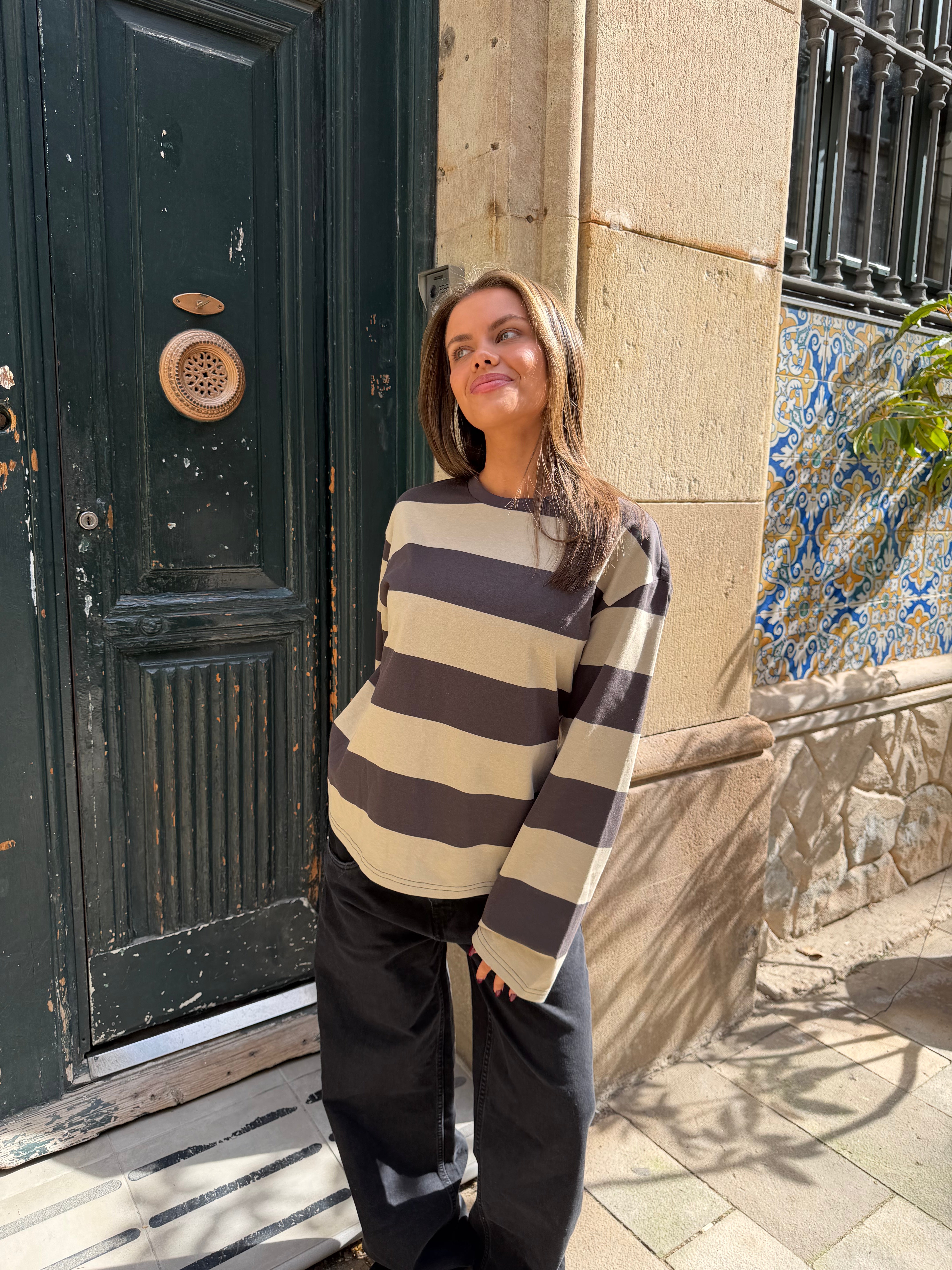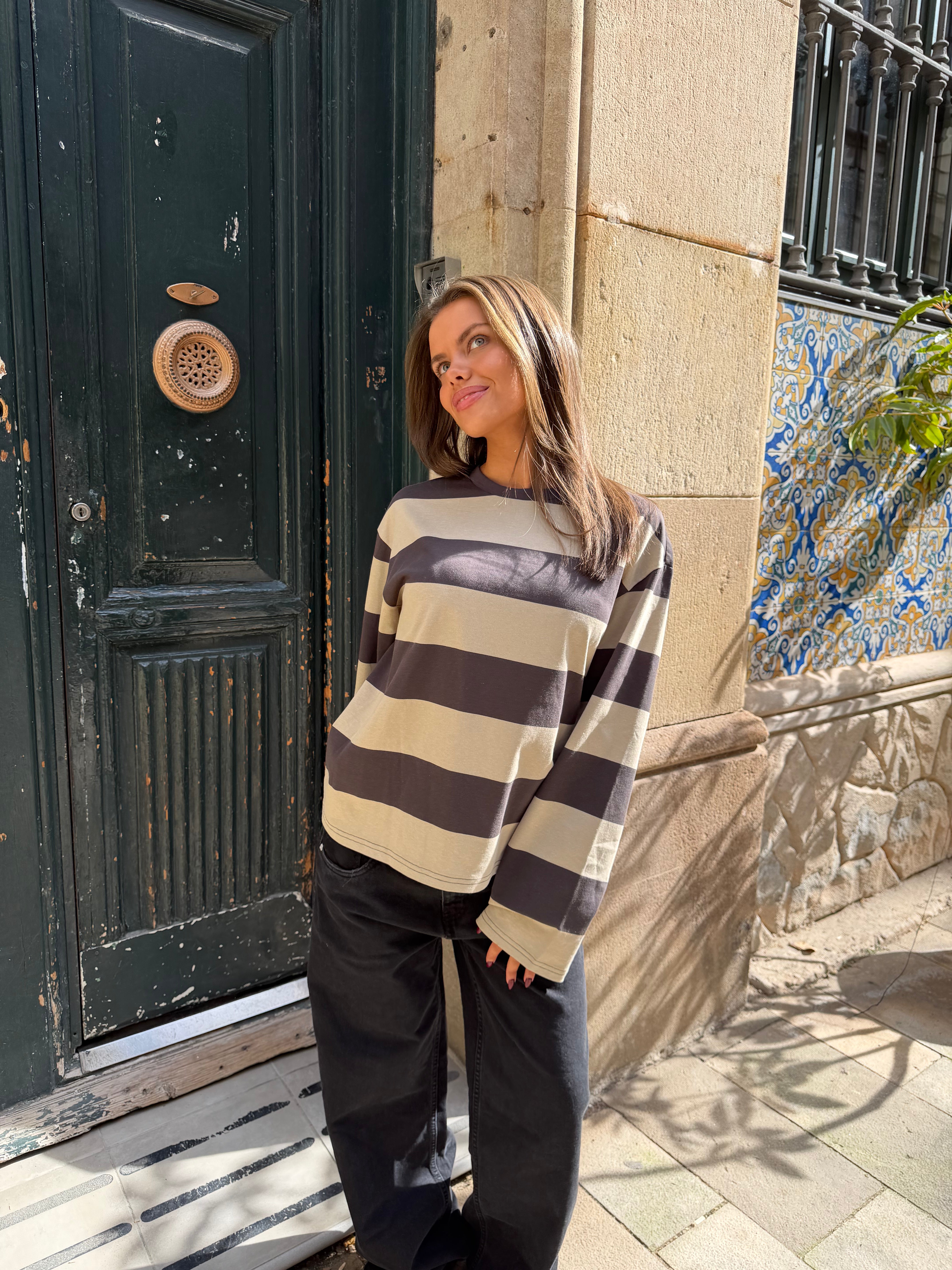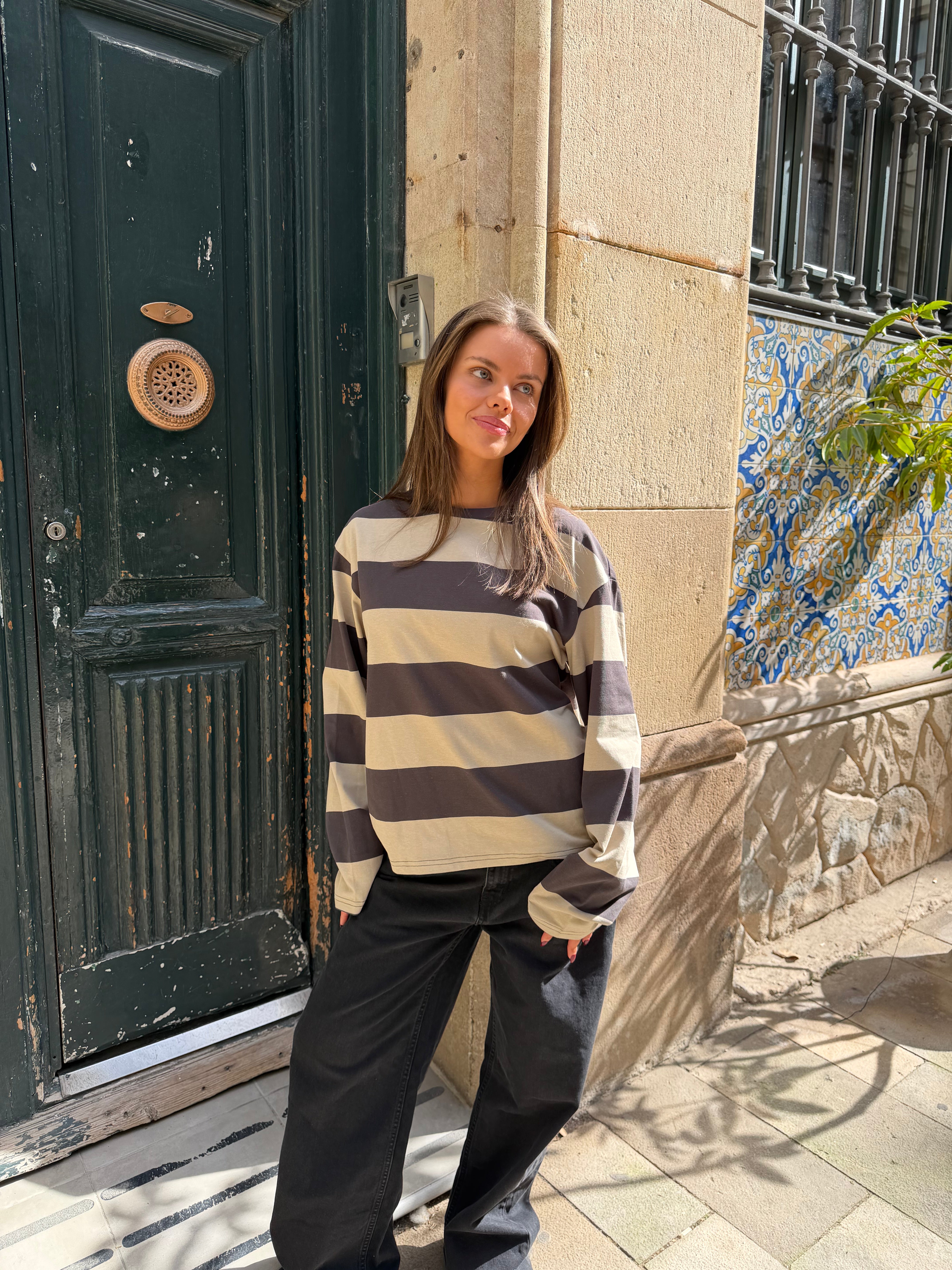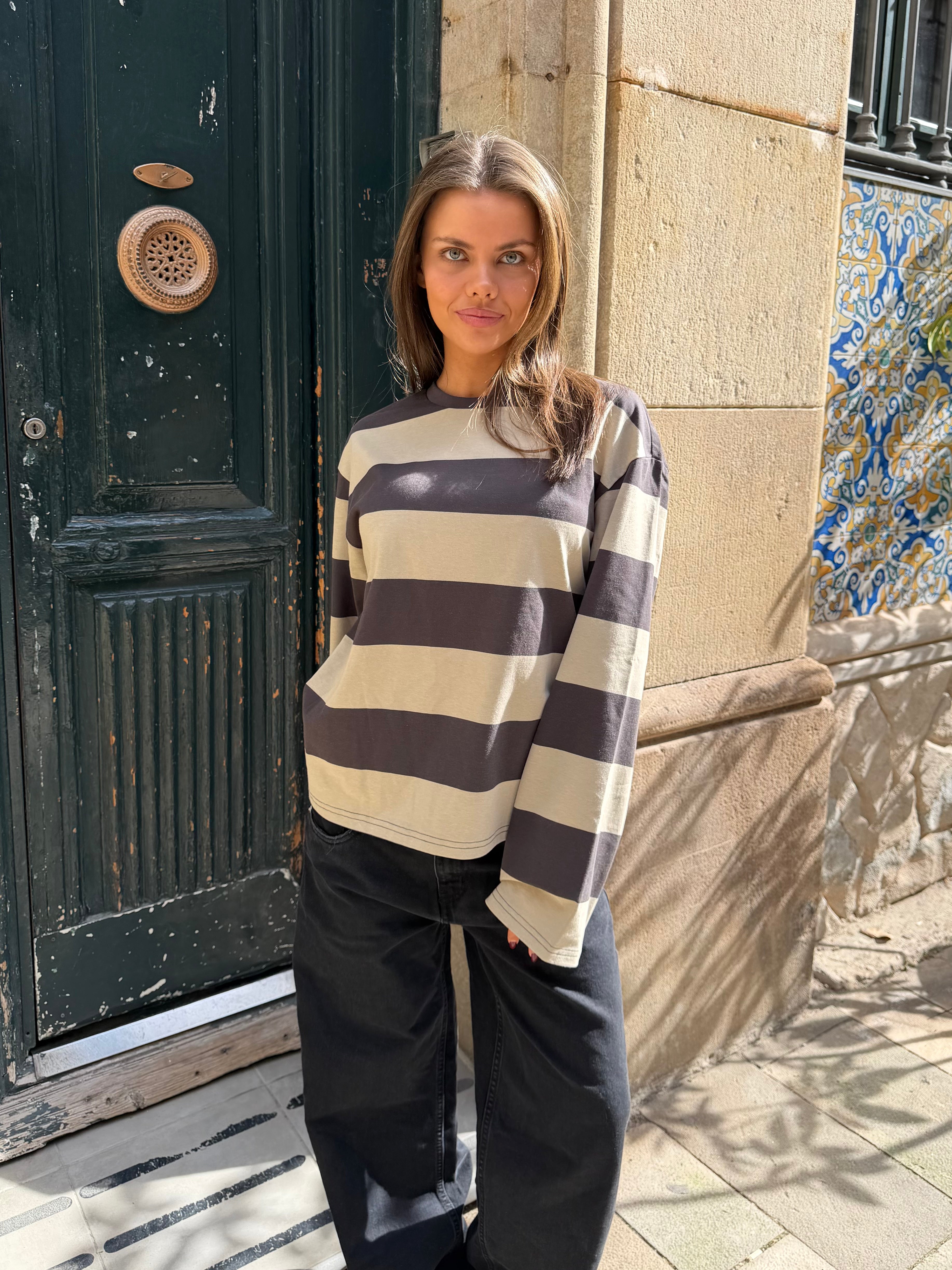 Nice oversized striped tee with long sleeves and a nice vintage-washed look..