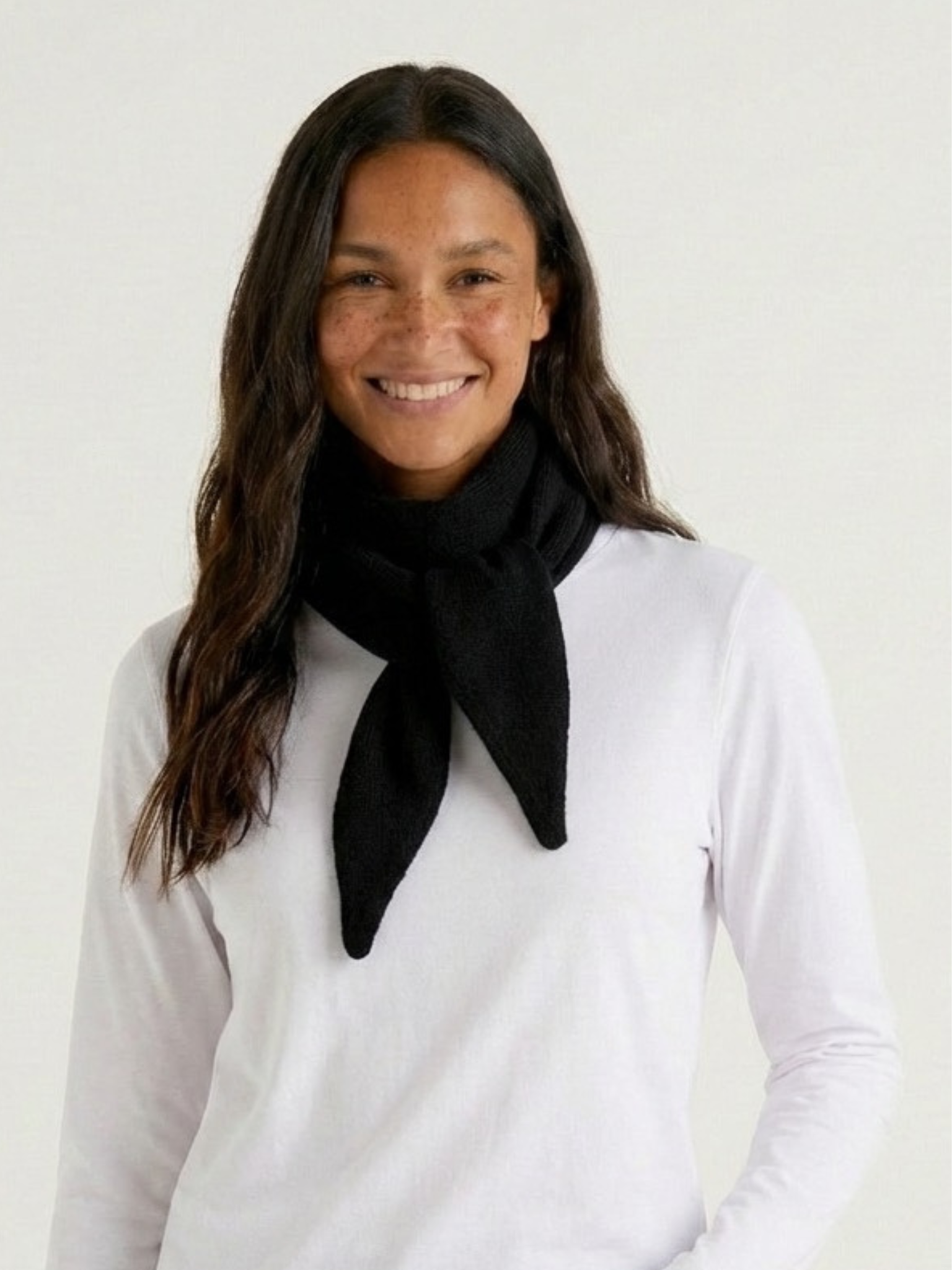 This triangle scarf combines soft and lightweight materials that feel comfortable against the skin. The fabric drapes beautifully and elegantly, making the scarf a versatile accessory for the fall season. With its solid black hue, it can be easily styled for both everyday wear and more formal occasions.