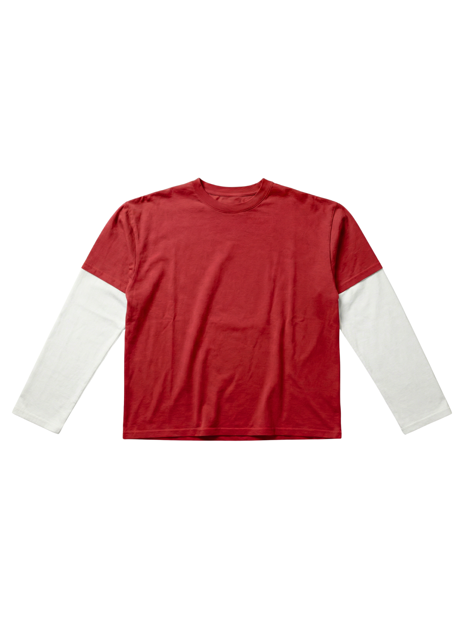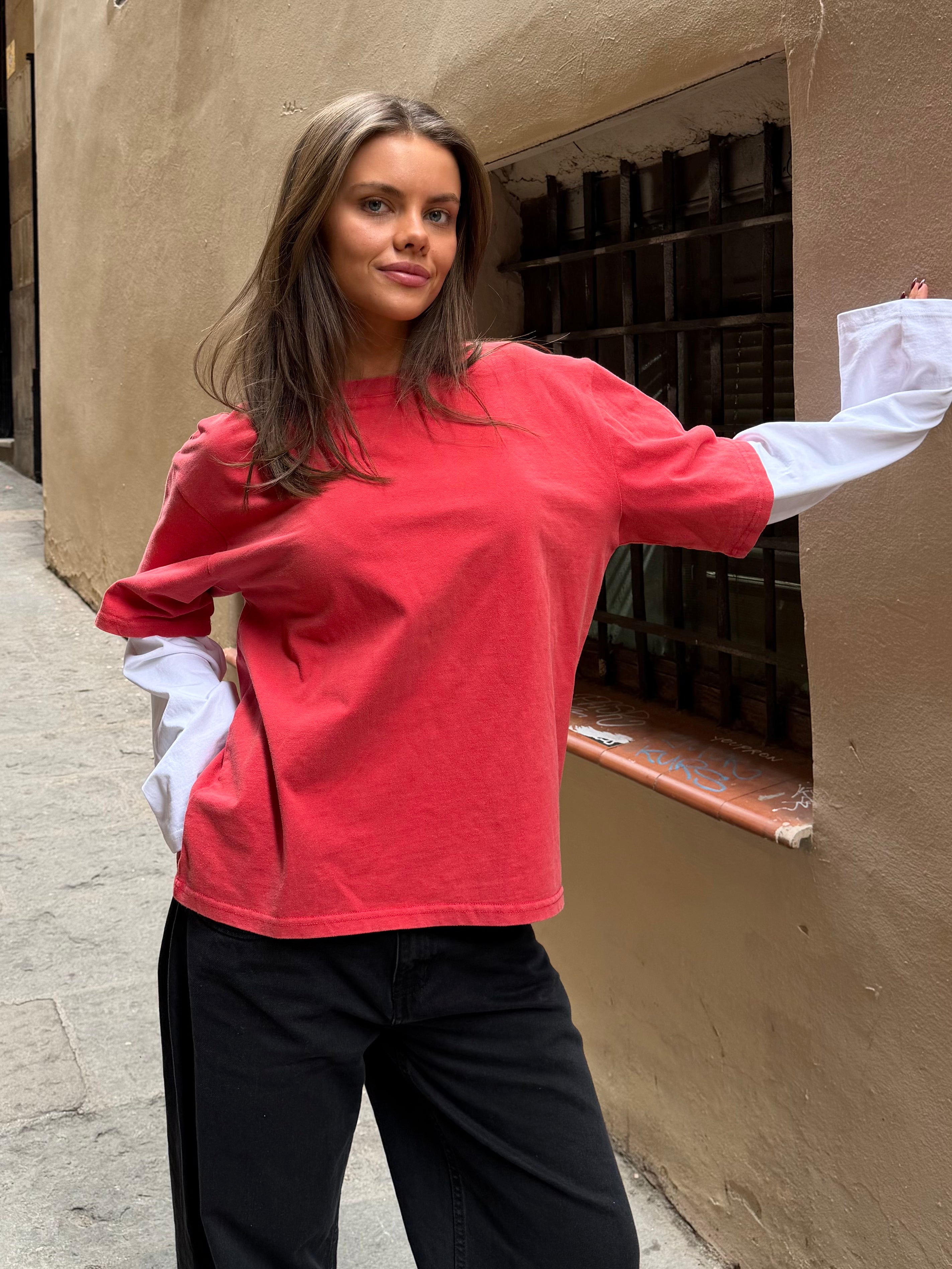 Nice oversize layered tee with long, wide sleeves. The long-sleeved T-shirt is attached to the short-sleeved vintage-washed tee with short sleeves.