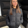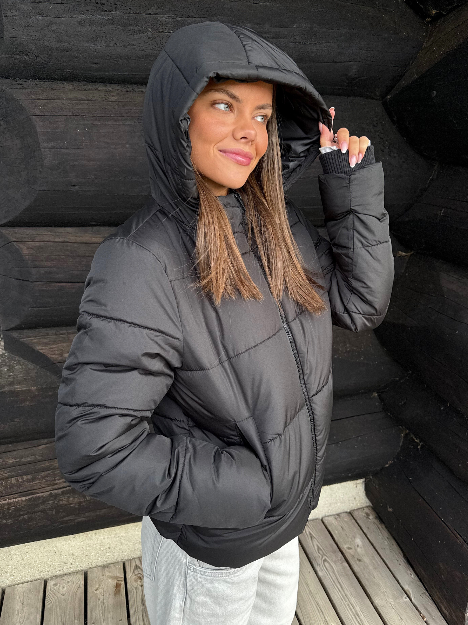This short puffer jacket is designed for young women and combines functionality with a modern look. The jacket has a practical hood and long sleeves with ribbed cuffs, ensuring a close fit and extra comfort. Lined with polyester padding, it provides warmth, while the black color makes it easy to combine with different outfits. The jacket closes with a zipper and has side pockets for storing small items.