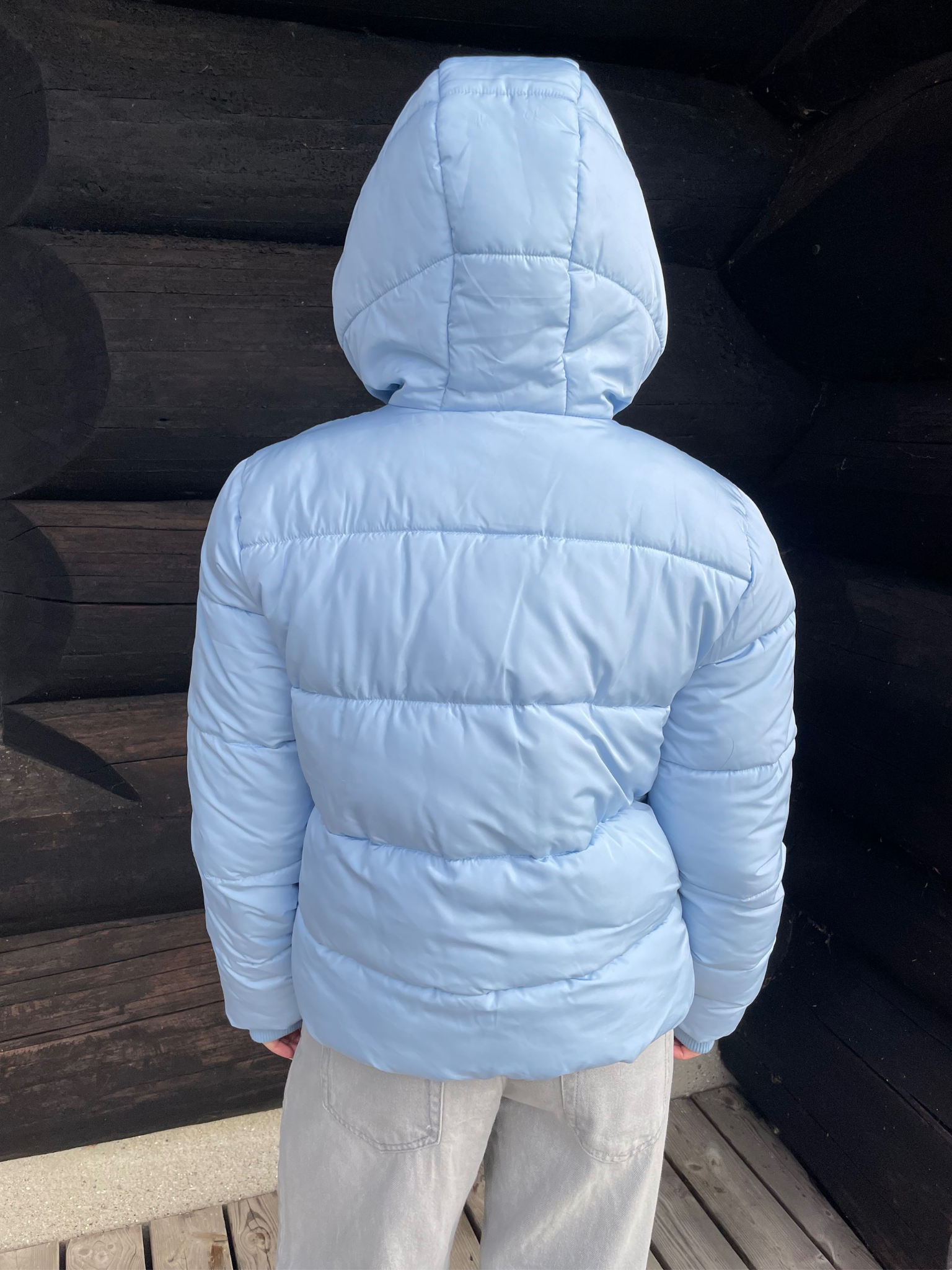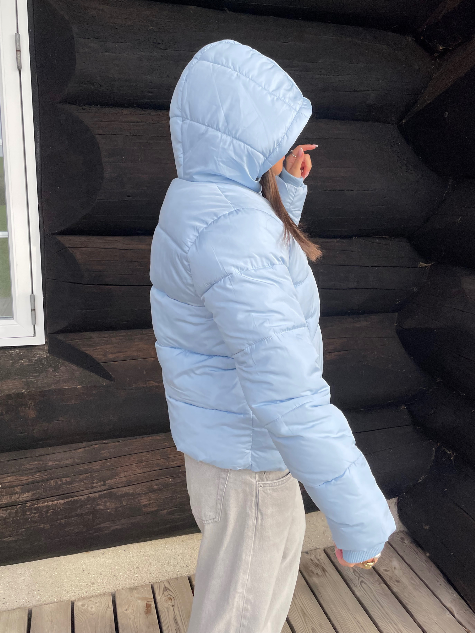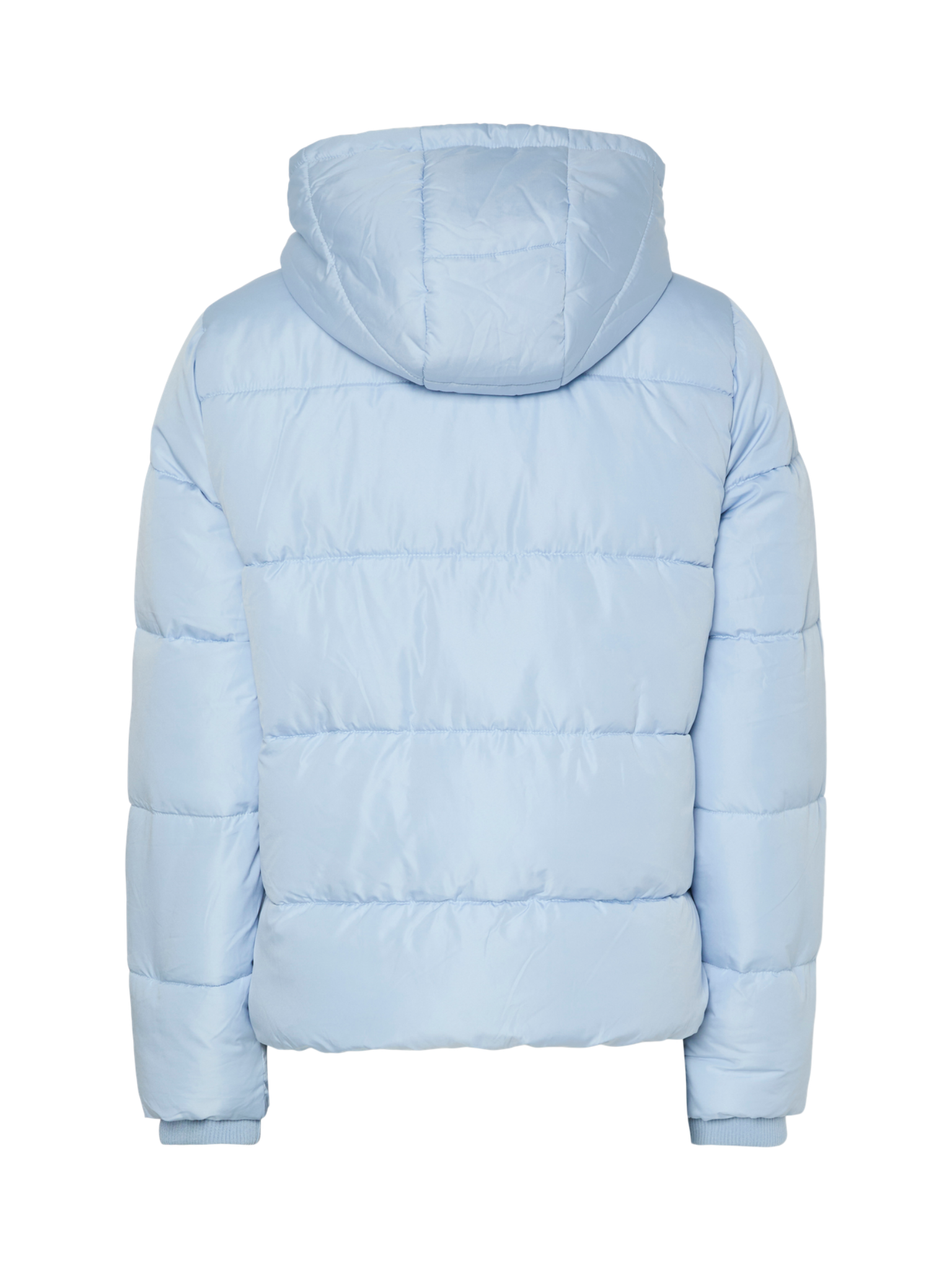 This short puffer jacket is designed to provide warmth and comfort with its soft filling and lightweight material. The jacket has a hood that protects from wind and weather, as well as practical side pockets for storage. The ribbed armholes ensure a good fit, and the zipper makes it easy to take on and off. The jacket is made from recycled polyester, making it a sustainable choice.