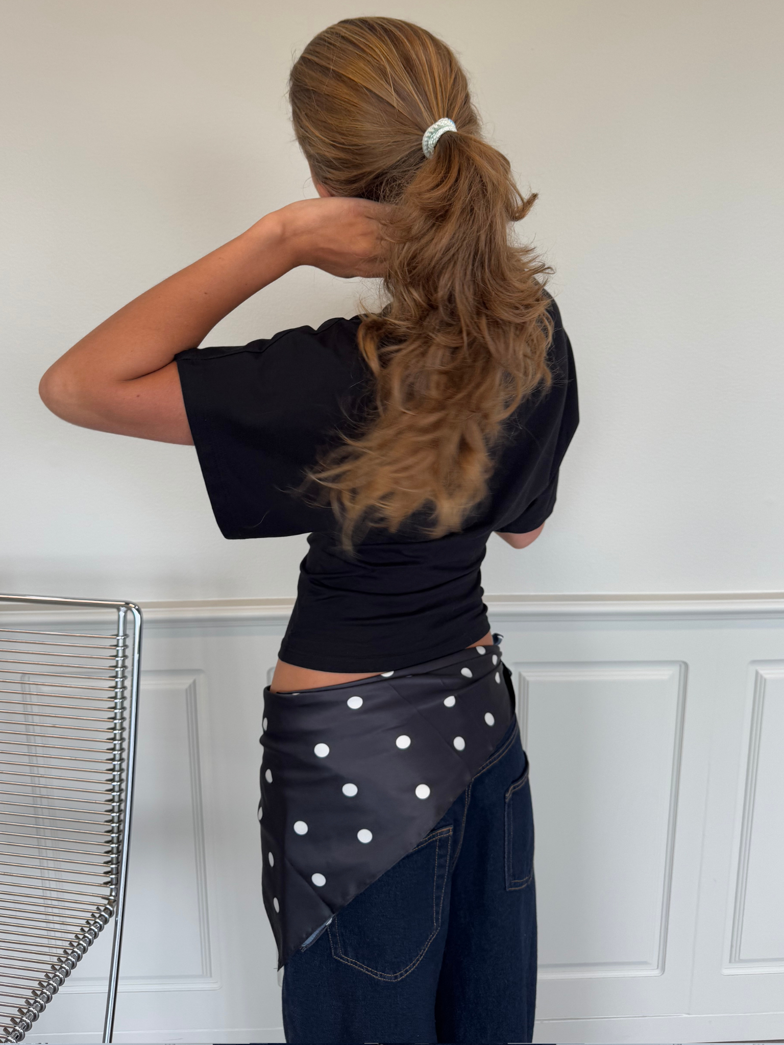 This lightweight scarf in black with a polka dot pattern is made from recycled polyester, making it a sustainable choice that also protects the environment by reducing waste and conserving natural resources. The scarf comes in a one-size-fits-all design, adding a stylish and unique touch to any fall outfit.