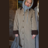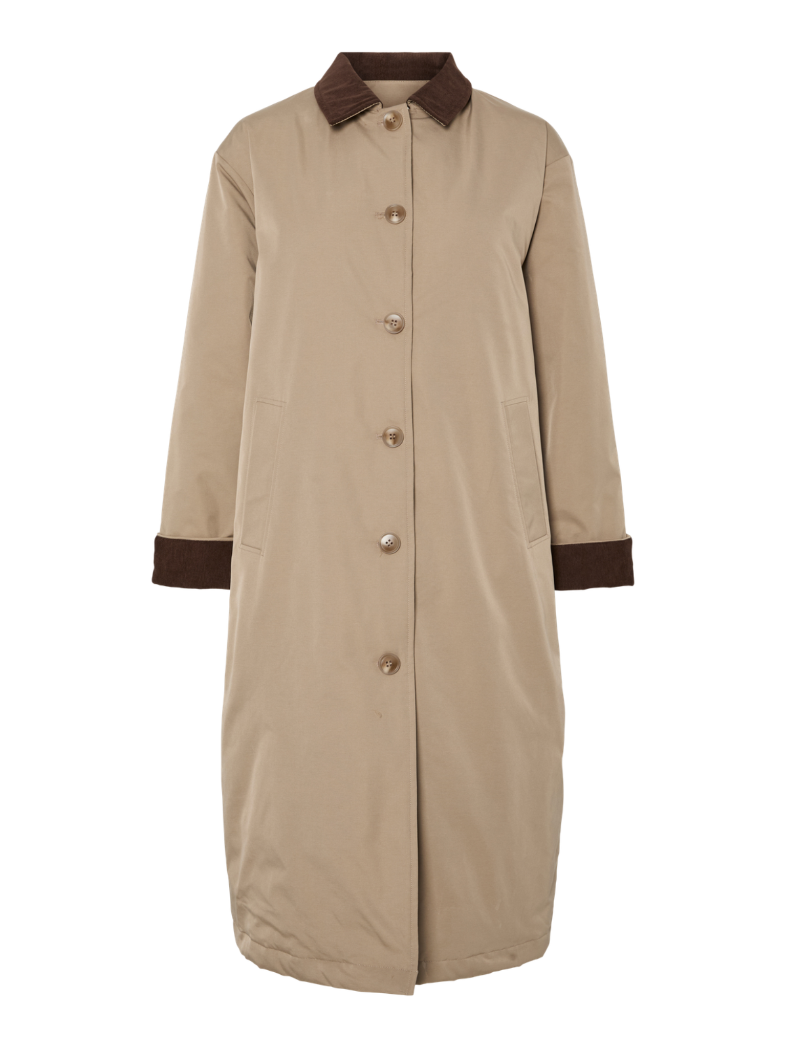 This long corduroy jacket in a soft and stylish quality is perfect for the autumn weather. The jacket has a classic spread collar and closes with buttons, which gives a timeless look. The color Greige with a touch of Hot Fudge in the details makes it easy to combine with both everyday and more relaxed outfits. The fabric consists of a blend where over half is recycled polyester, which contributes to a more sustainable wardrobe.