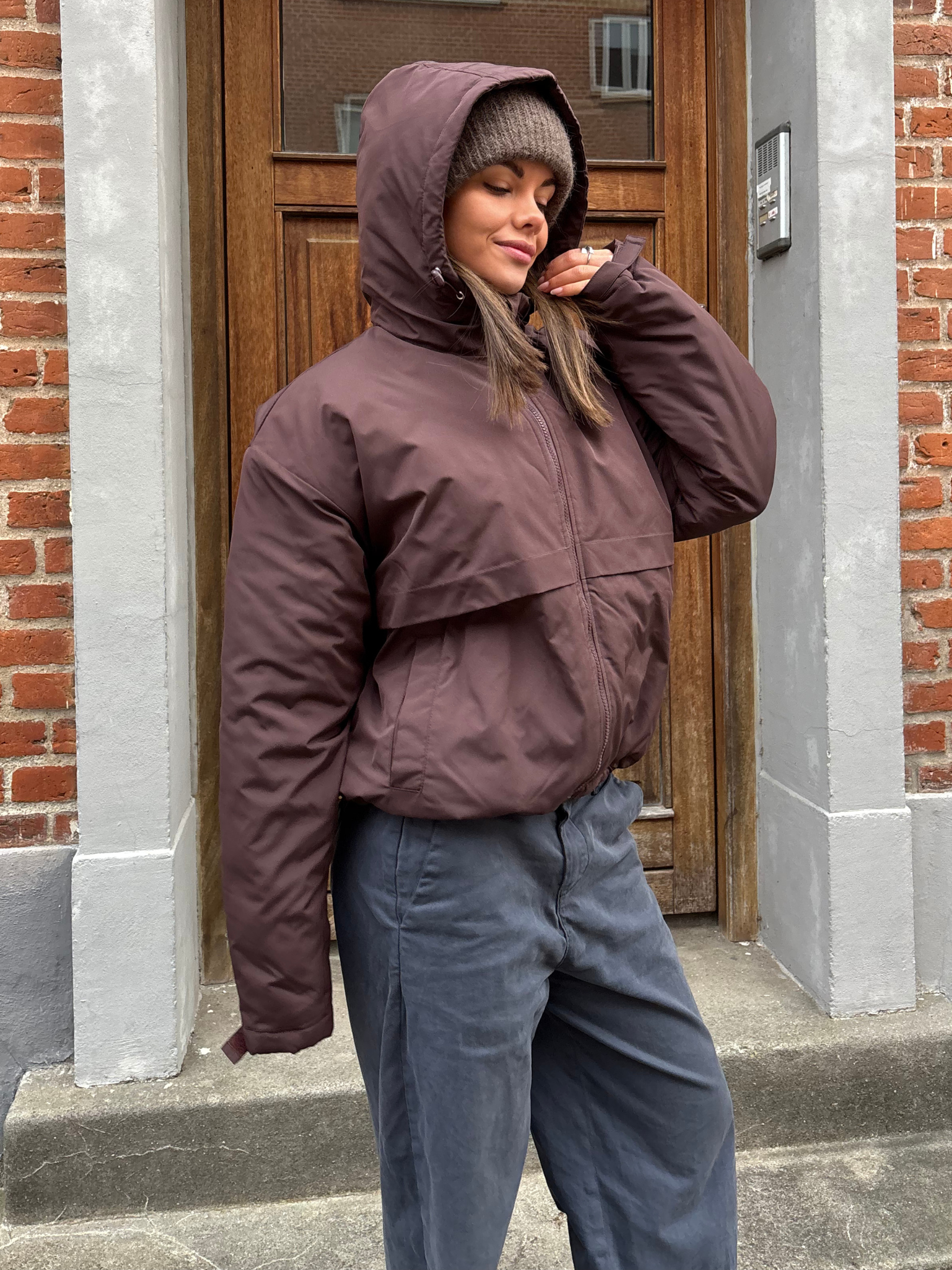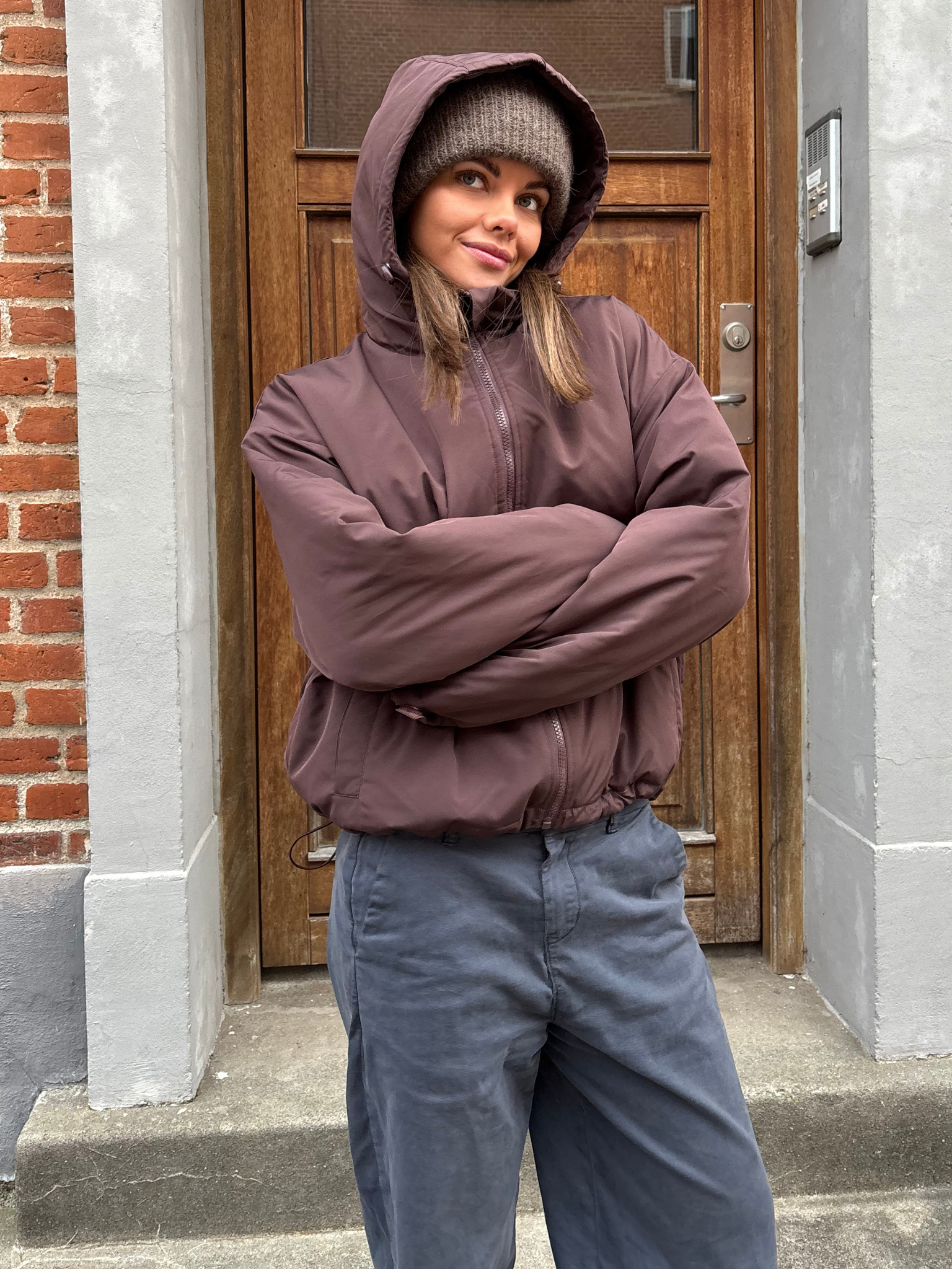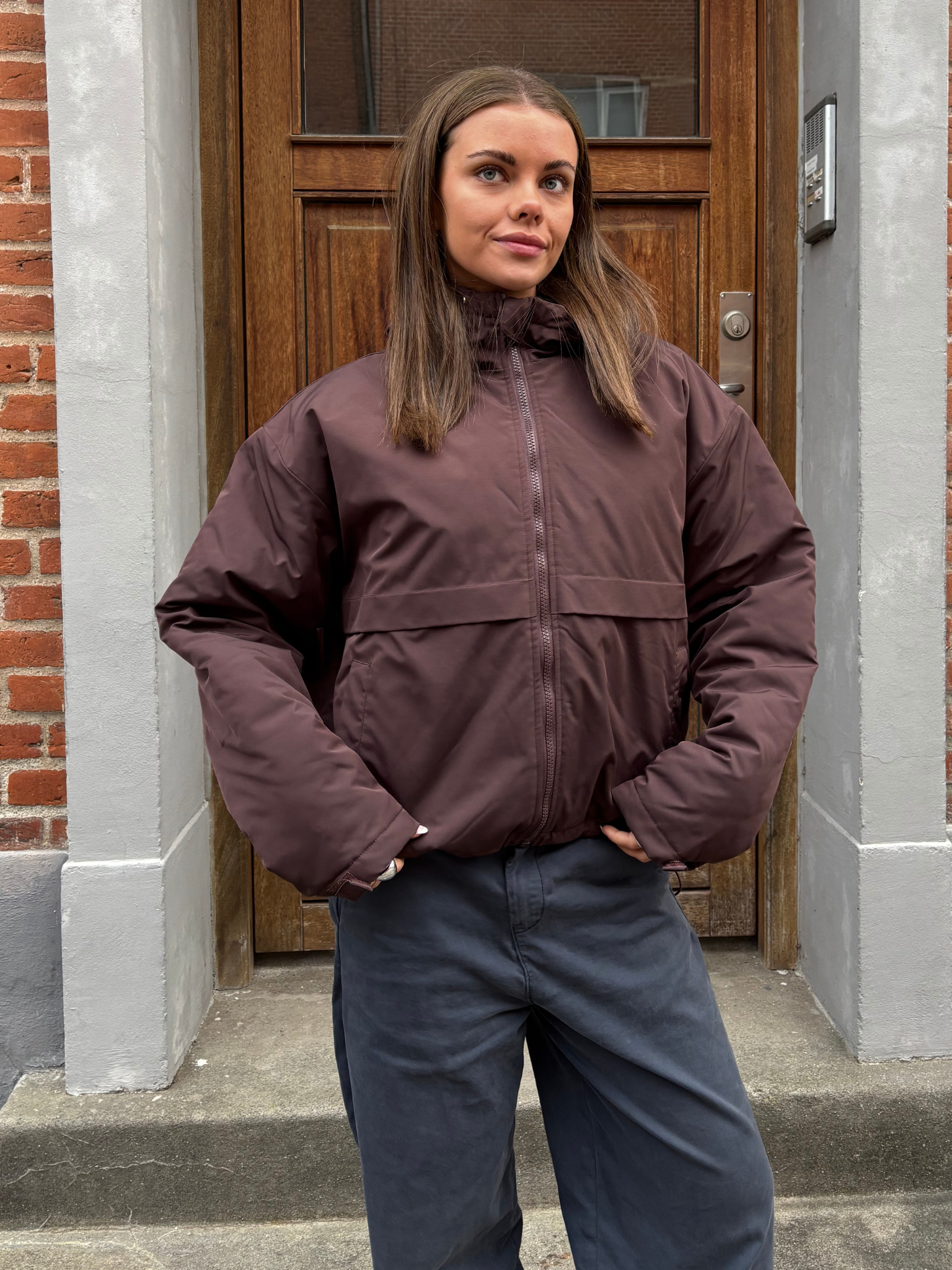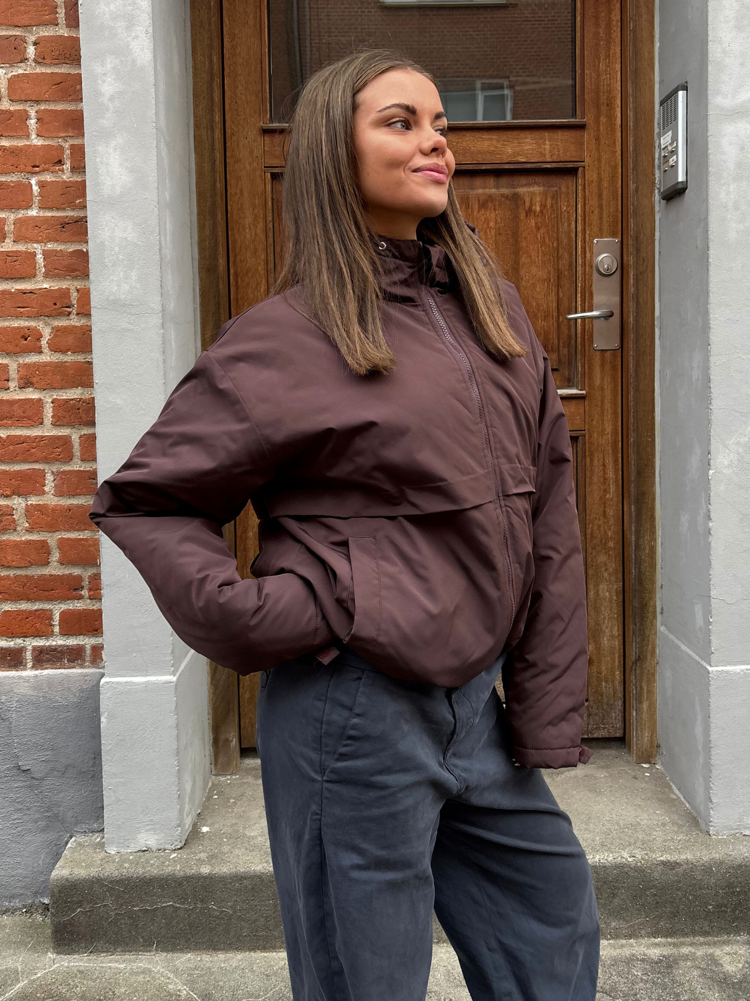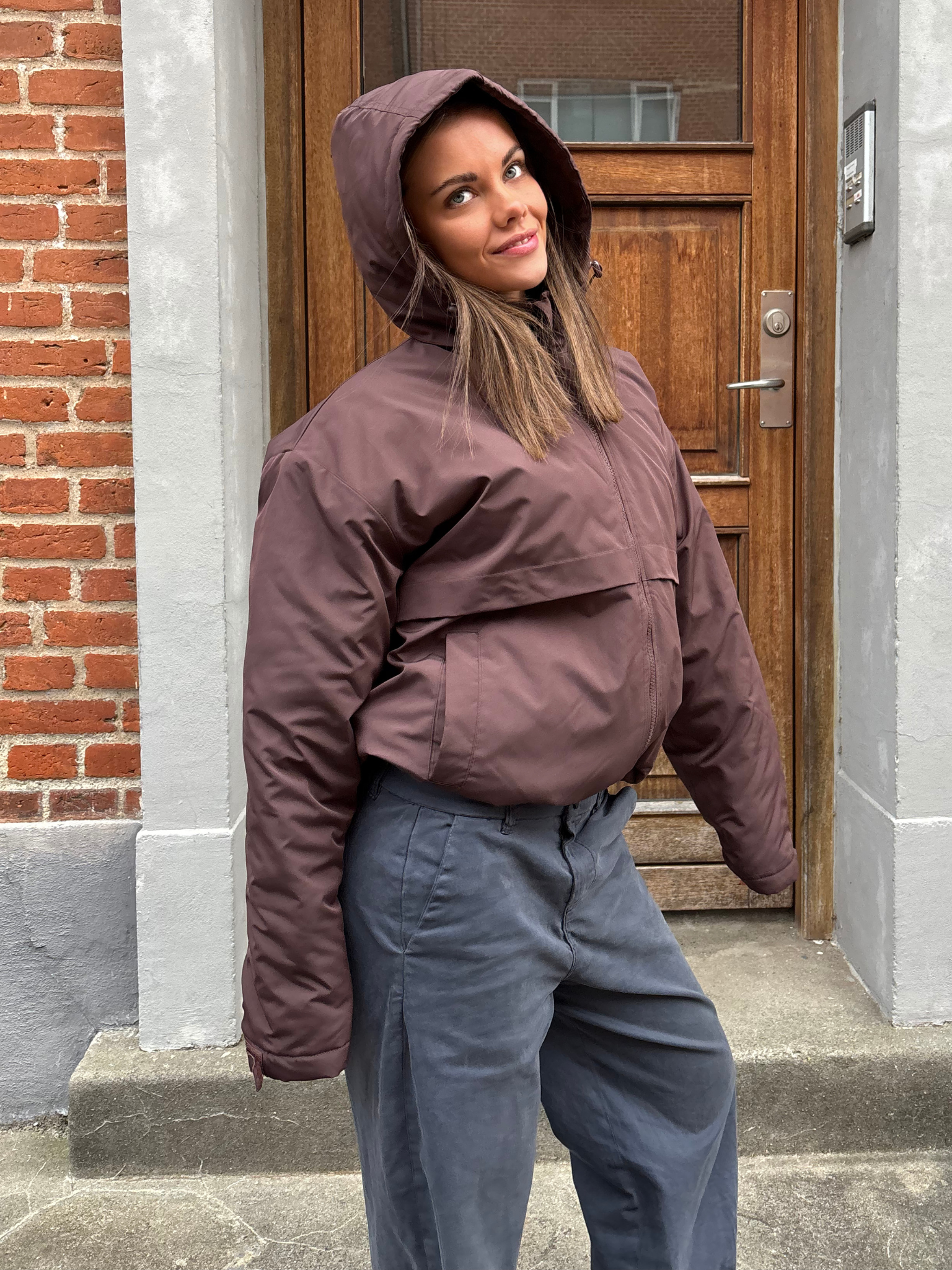 Really nice jacket with a soft surface. Perfect length that can be tightened at the bottom. Nice big hood..