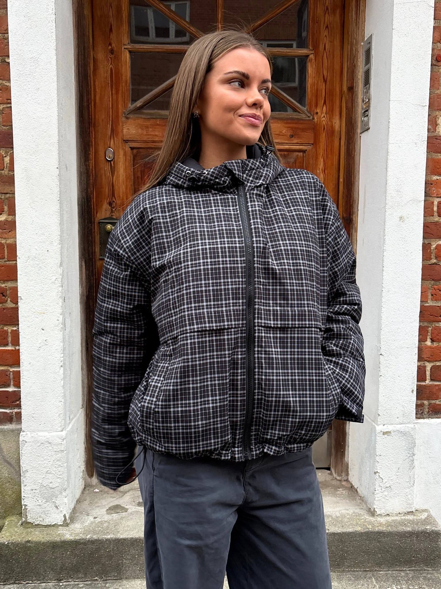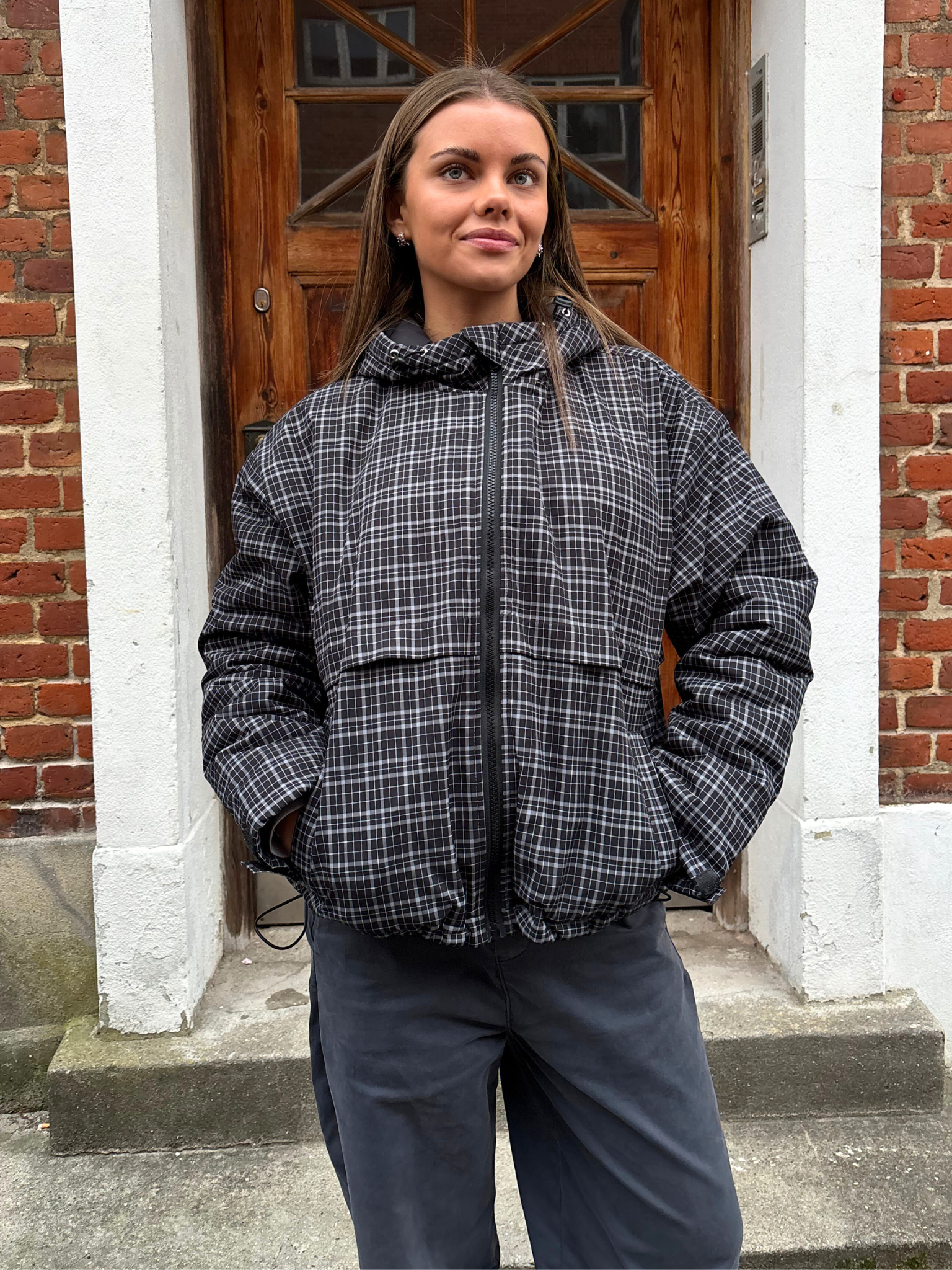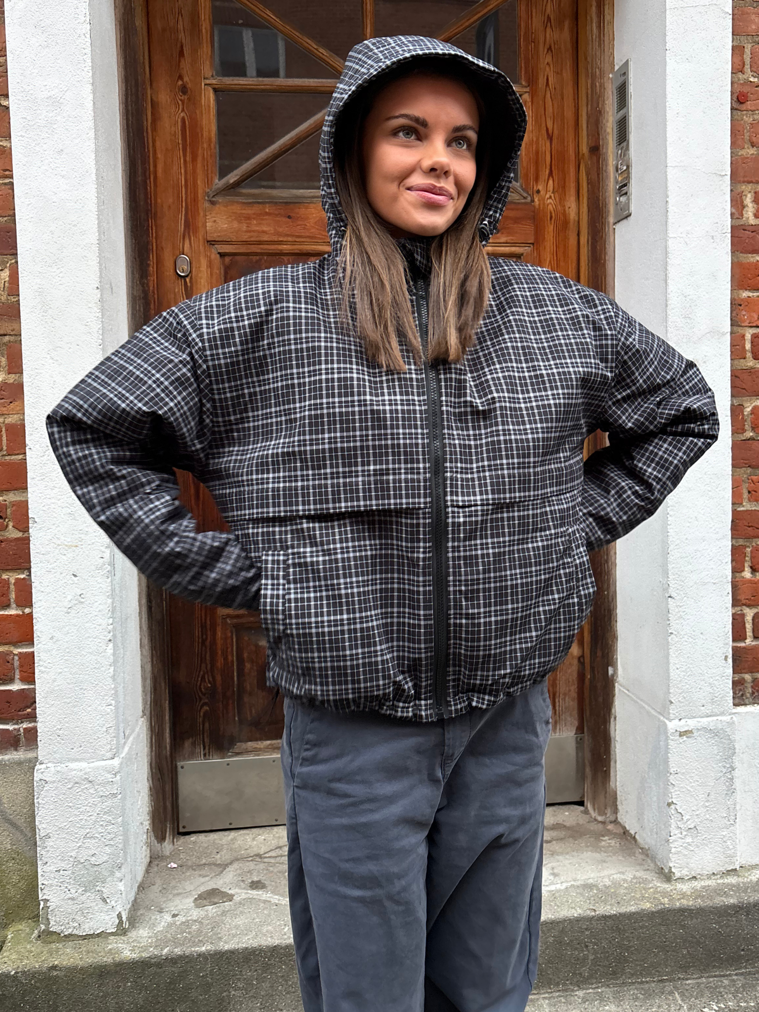 Really nice jacket with a soft surface. Perfect length that can be tightened at the bottom. Nice big hood..