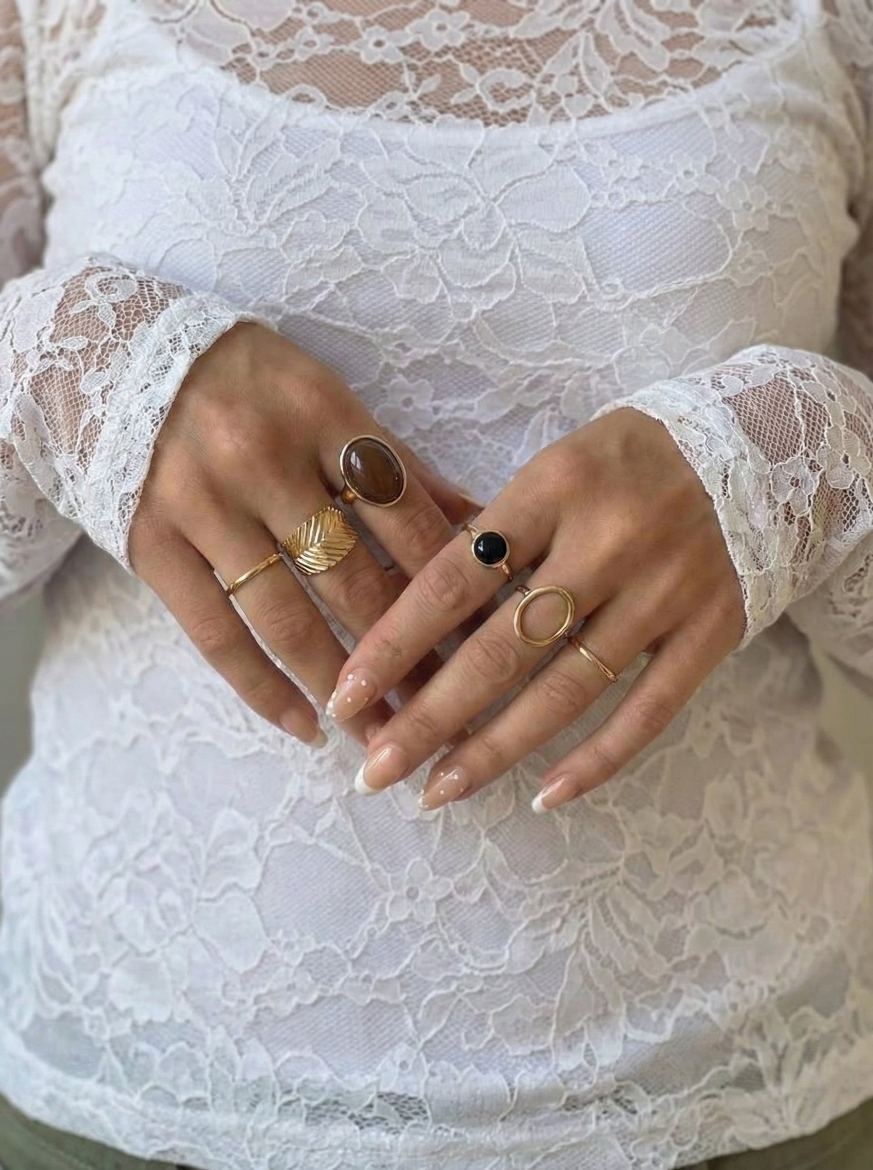 A set of six rings in a golden hue that suits a youthful and relaxed style. The rings combine the materials zinc and plastic, which gives a comfortable and light feel, while having a detailed design in a warm gold color. The one-size fit makes them easy to wear in everyday life.