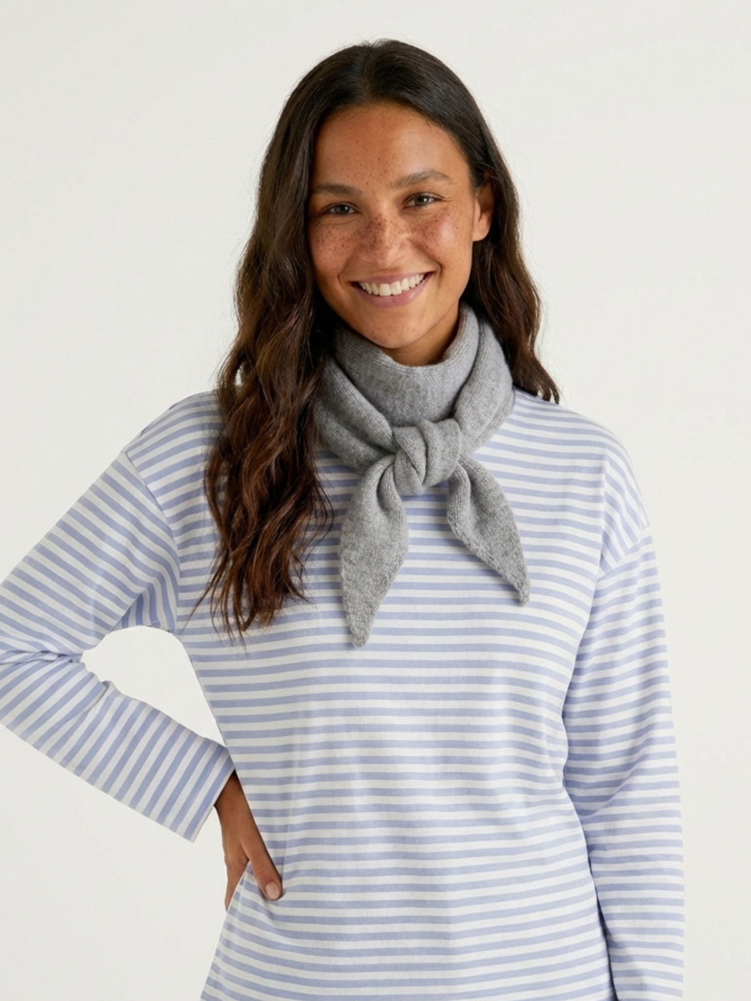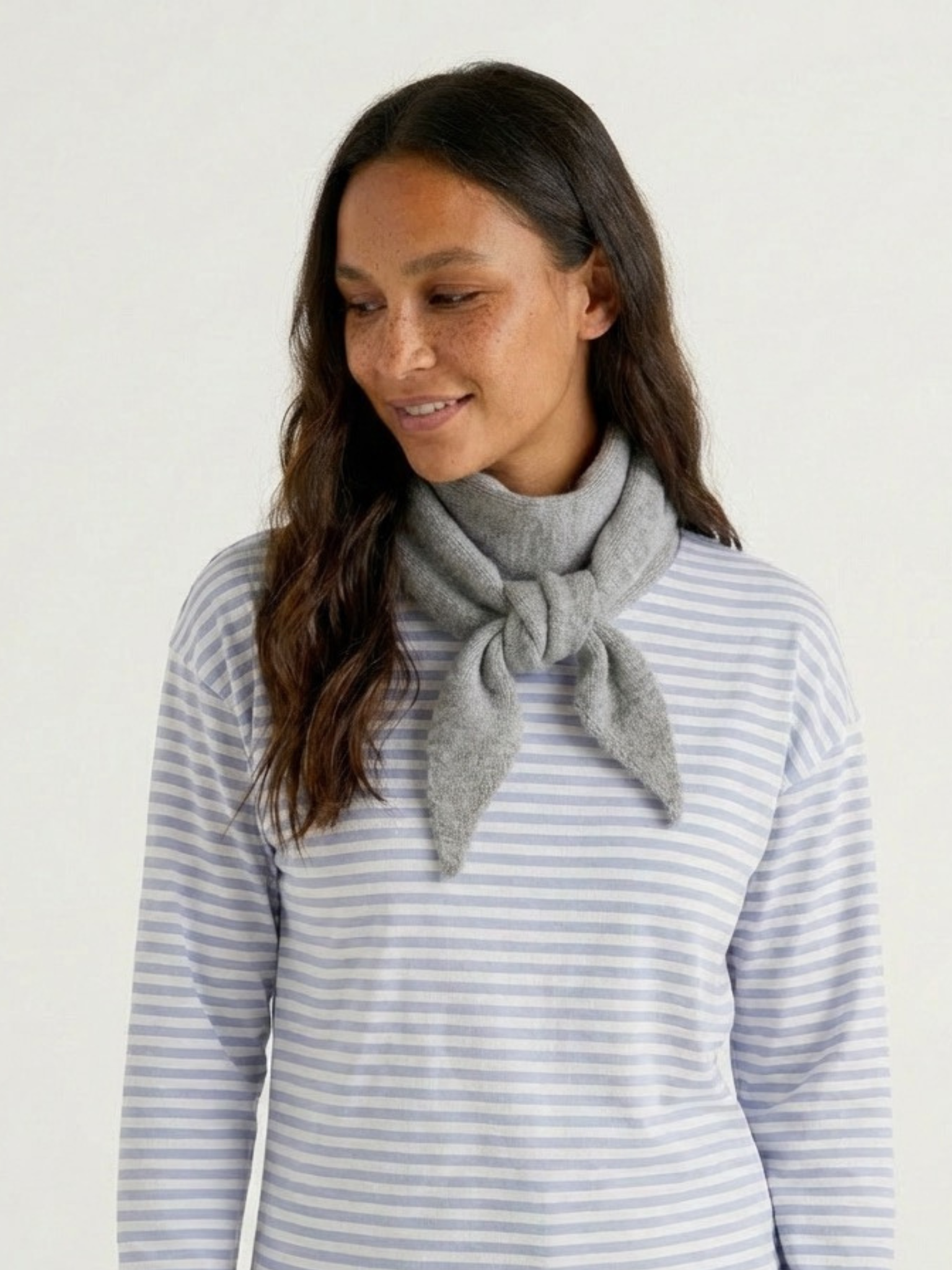 This triangular scarf in medium grey melange is crafted from a soft and smooth quality, with viscose providing a light silky feel, complemented by polyester and nylon for durability and structure. It has a one-size fit and is perfect for adding a stylish layer during the transition periods towards autumn and winter, when the cold starts to set in.