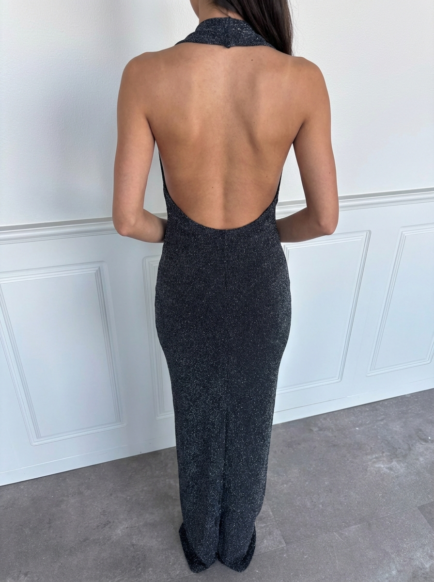 Beautiful long glitter dress with halterneck and open back