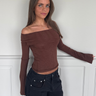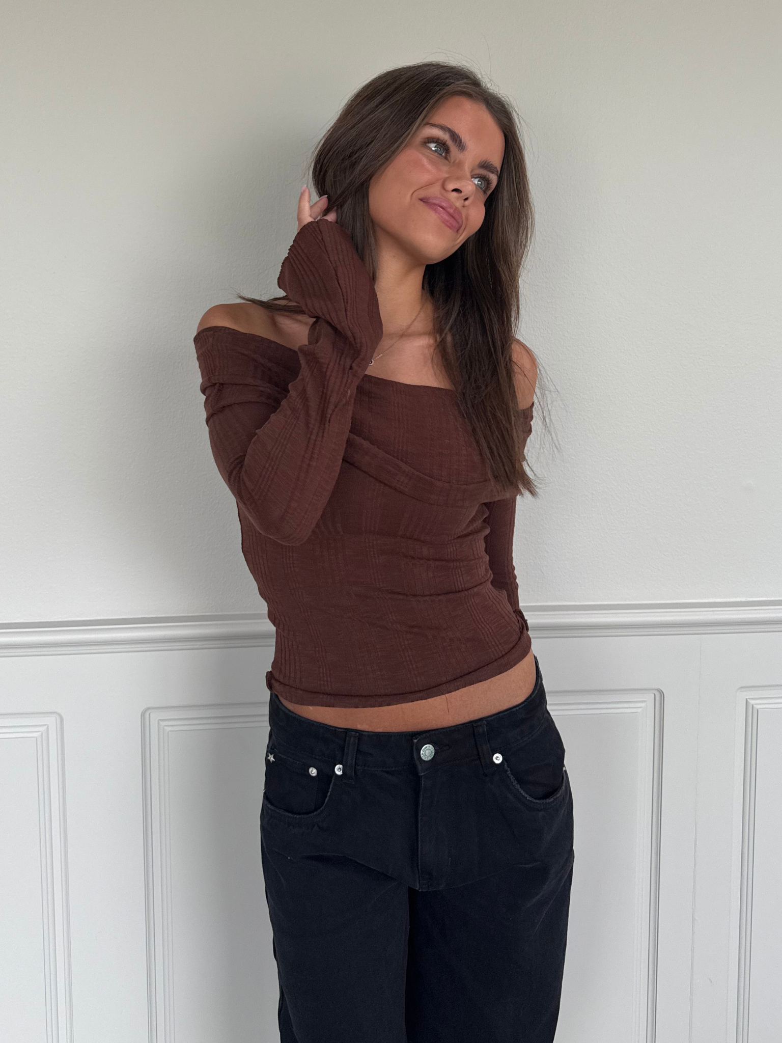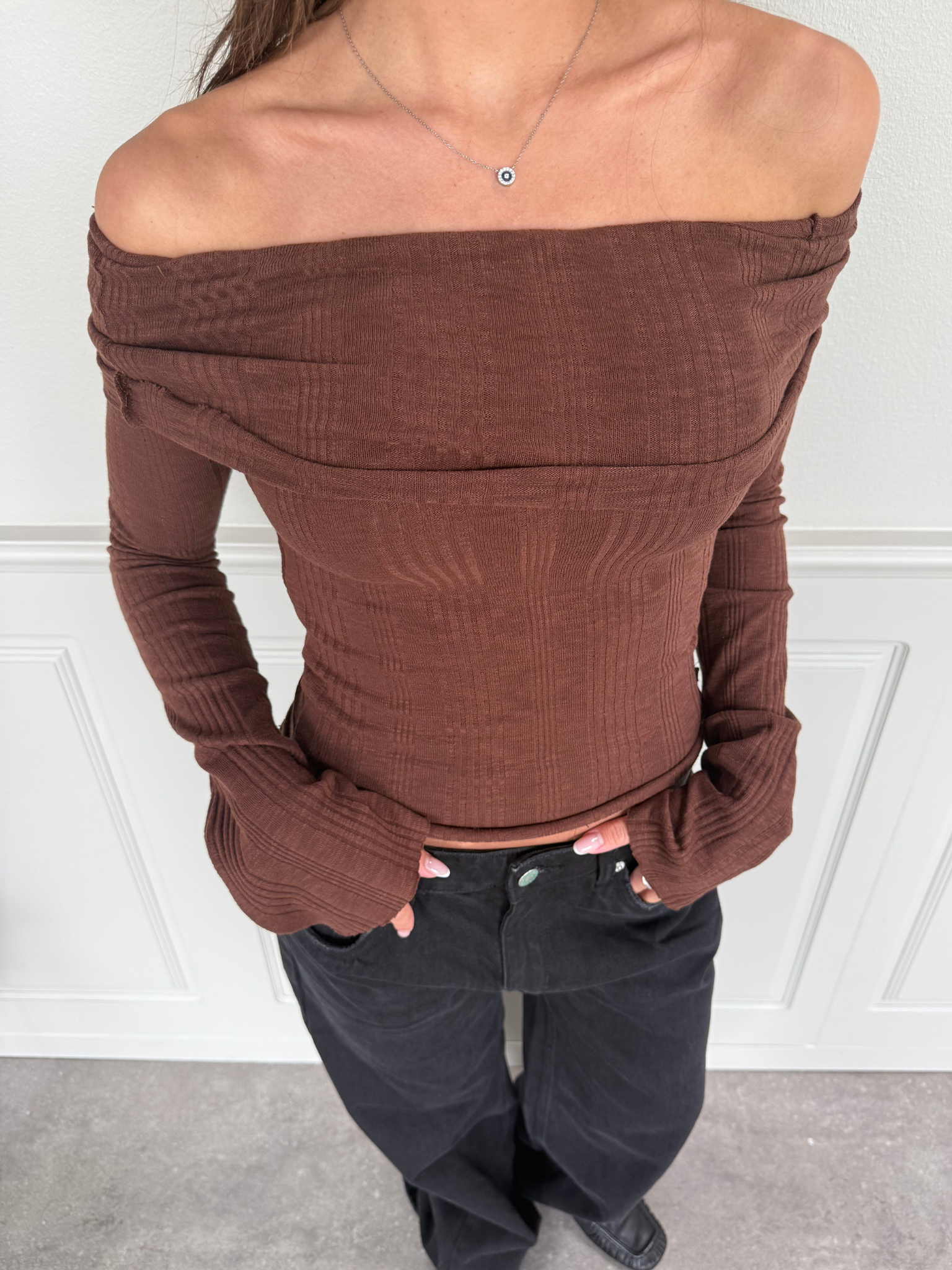 Beautiful off-the-shoulder top with a tight fit In a lovely soft quality.. The sleeves have a romantic width at the bottom & reach well down over the palm of the hand.