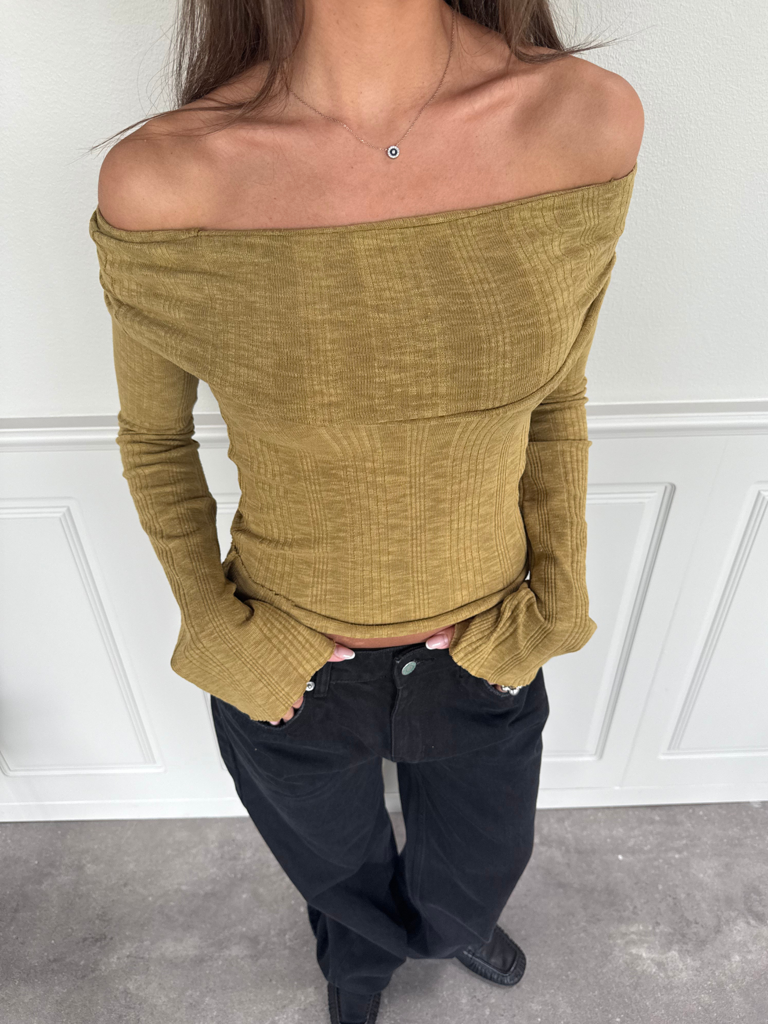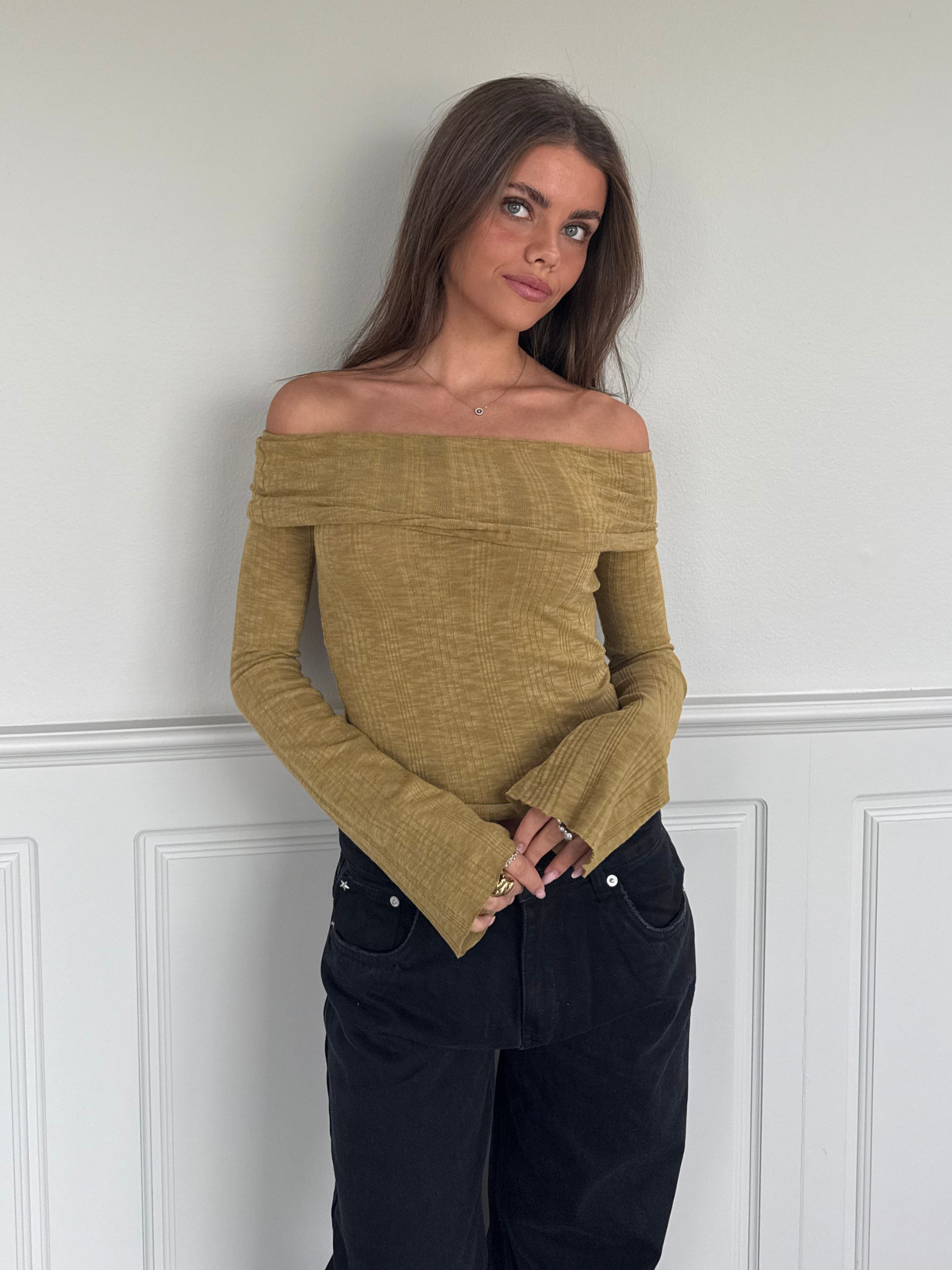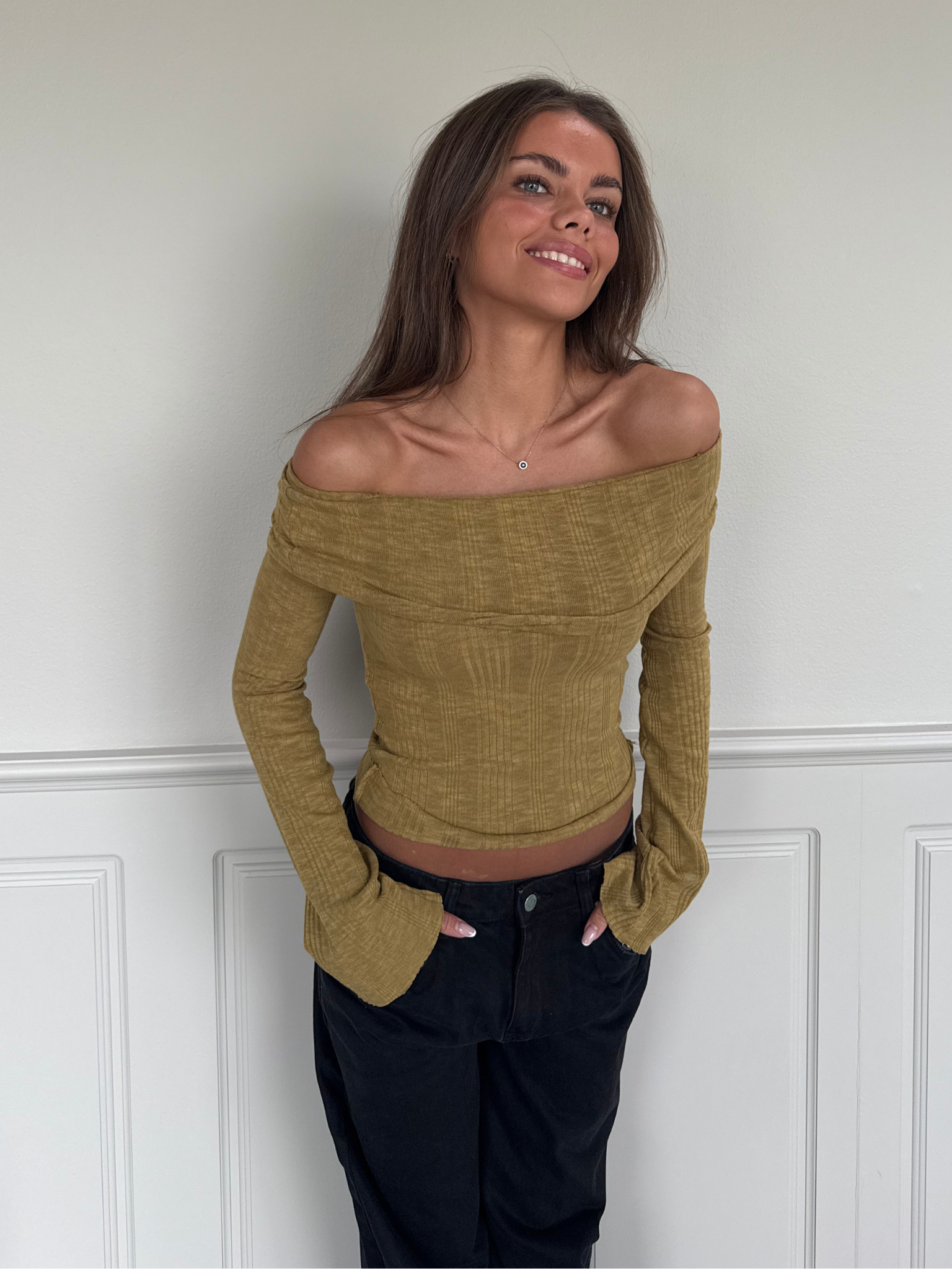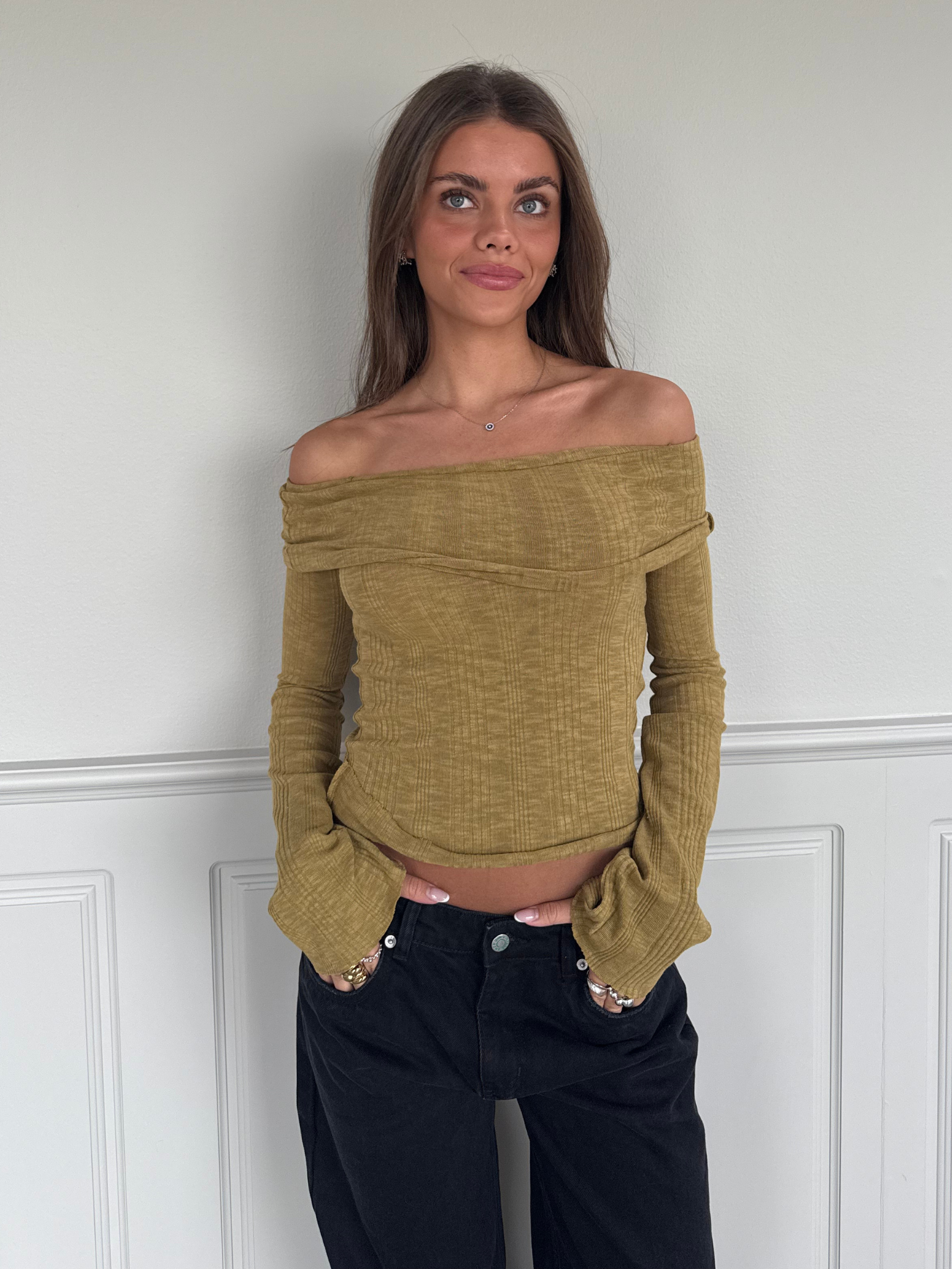 Beautiful off-the-shoulder top with a tight fit In a lovely soft quality.. The sleeves have a romantic width at the bottom & reach well down over the palm of the hand.