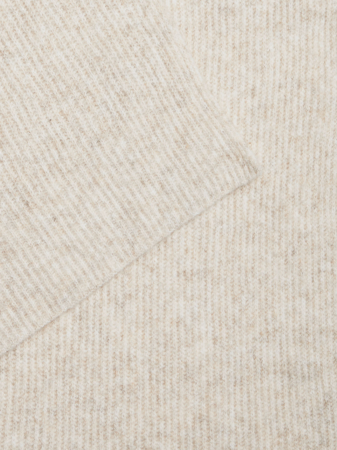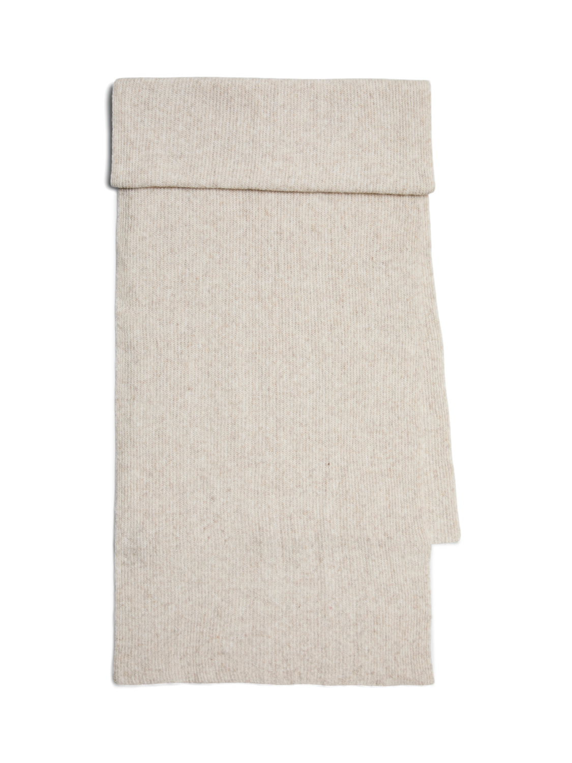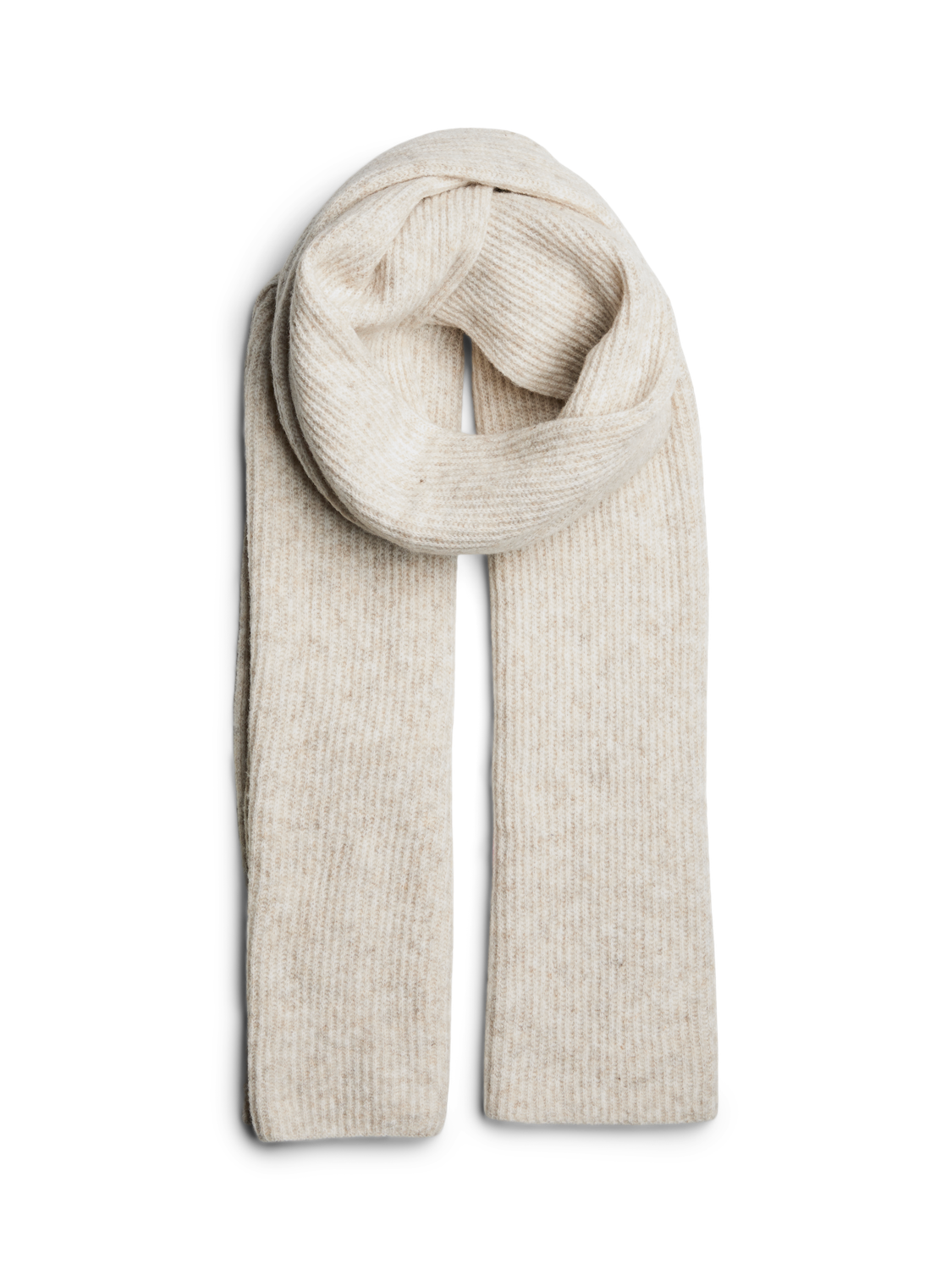 The scarf has a soft and stretchy rib structure with visible ribs on both the front and back, which provides a comfortable and flexible fit. It is made with consideration for the environment, as the main material consists of 80% recycled polyester, which helps to save natural resources and reduce waste. The other materials, including cashmere, elastane and wool, contribute to a luxurious and warm feel, making the scarf ideal for keeping warm in the colder months. The color is a gentle shade called Whitecap gray with a melange detail, which gives the scarf an elegant and versatile expression.